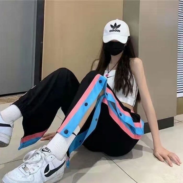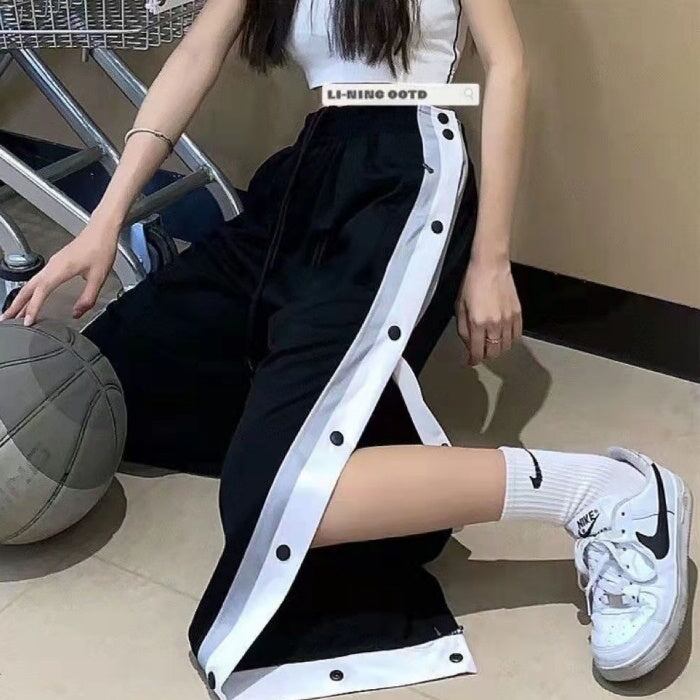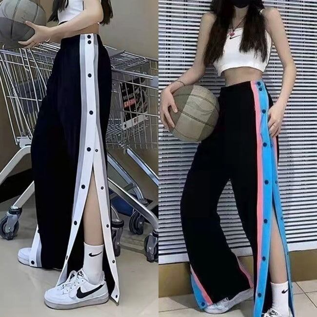 ラインパンツ サイドスリット ボタンパンツ レディース 韓国 ファッション 大きいサイズ おしゃれ カジュアル スポーティ ワイドパンツ サイドライン