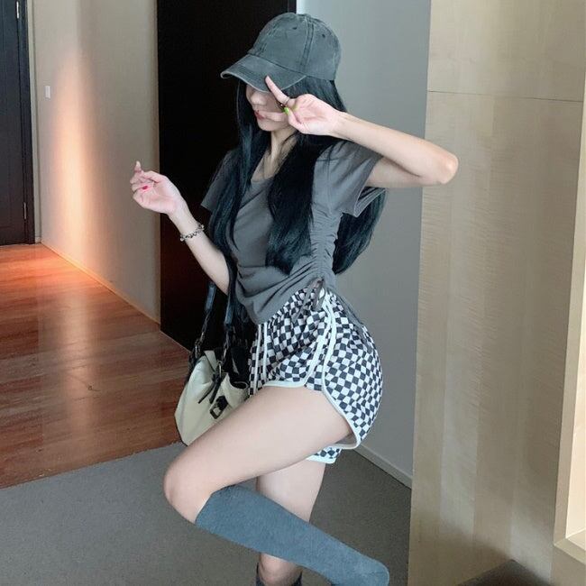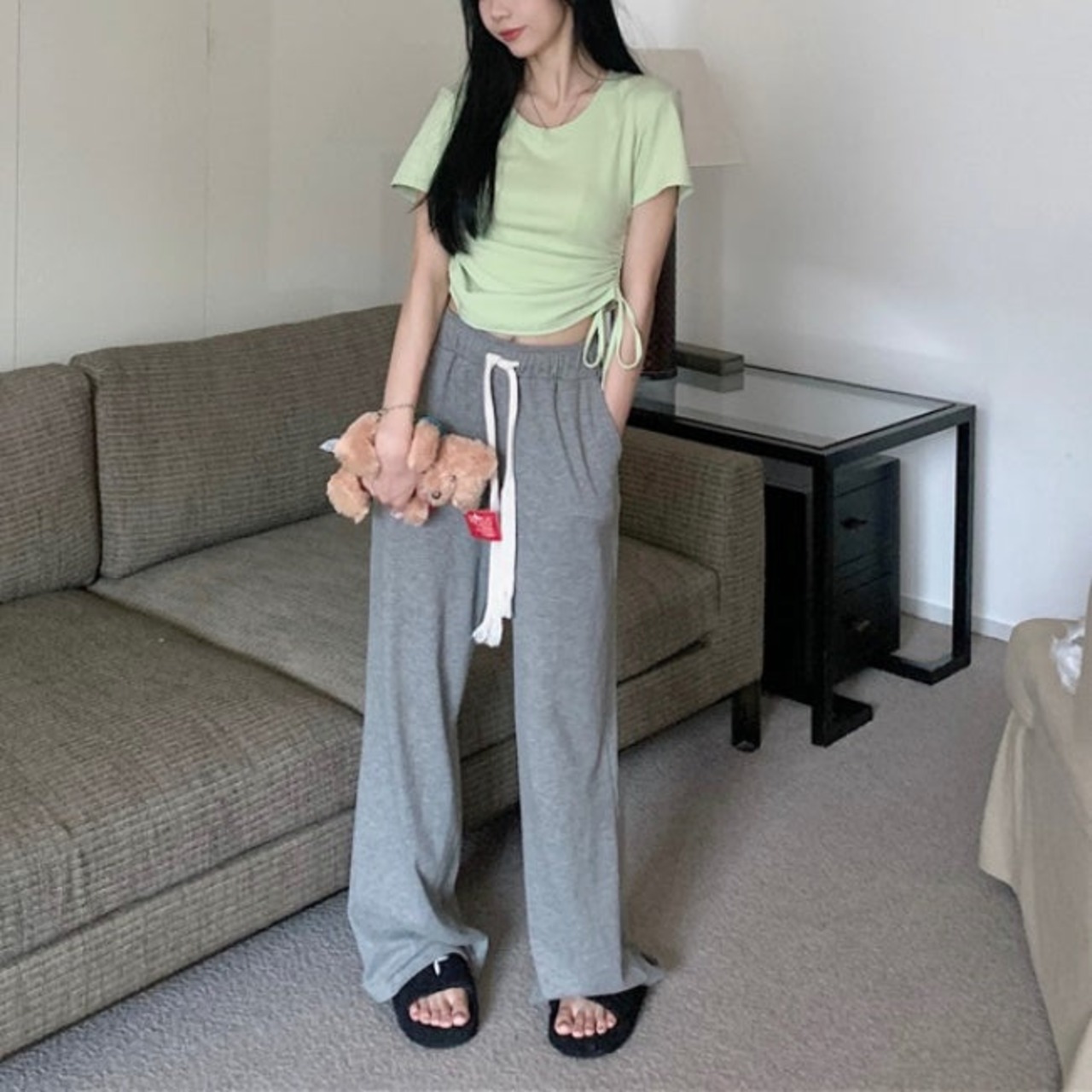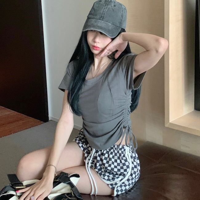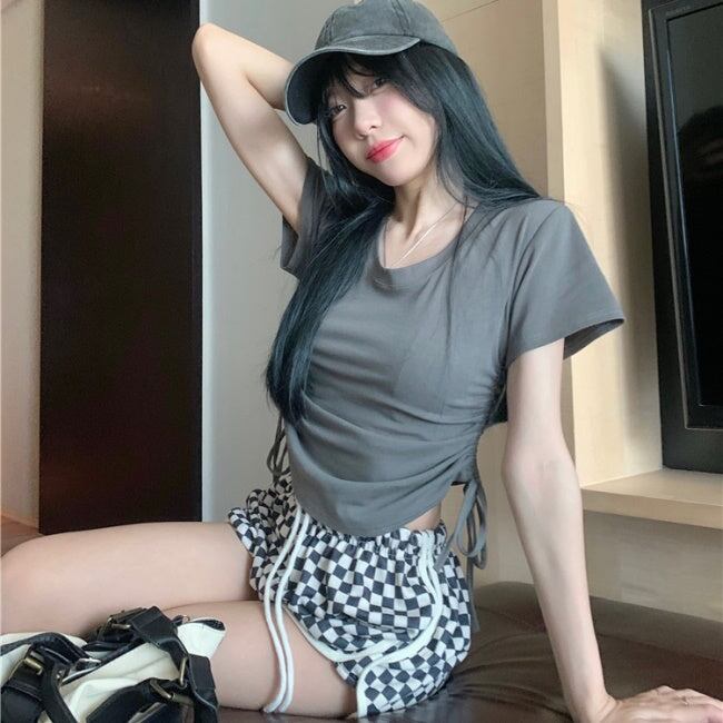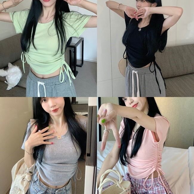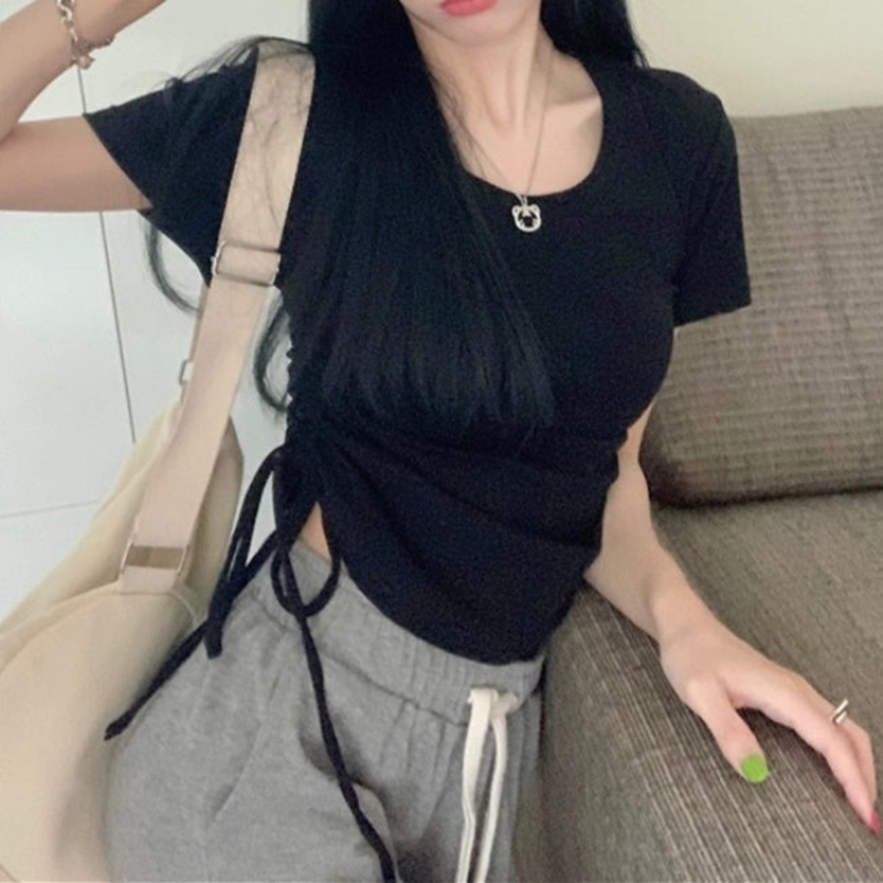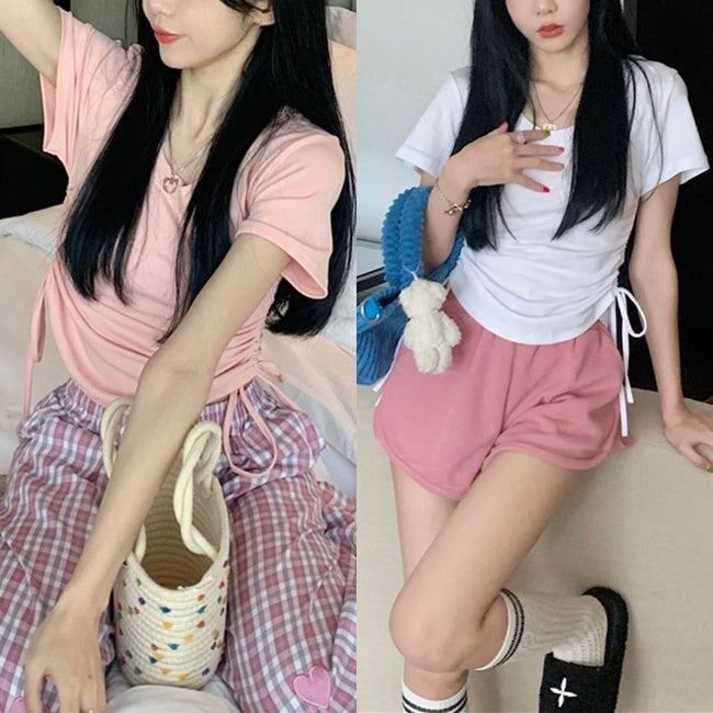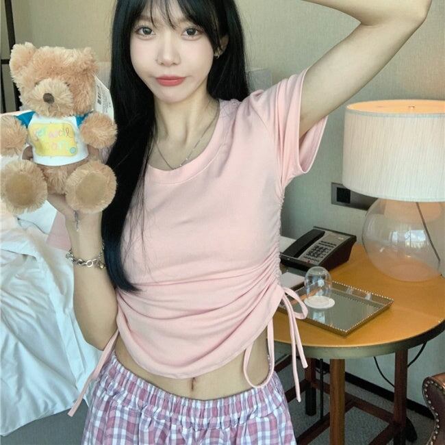 Tシャツ 半袖 レディース 韓国 ファッション ショートトップ サイドシャーリング ギャザー リボン かわいい おしゃれ 夏 カットソー