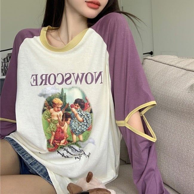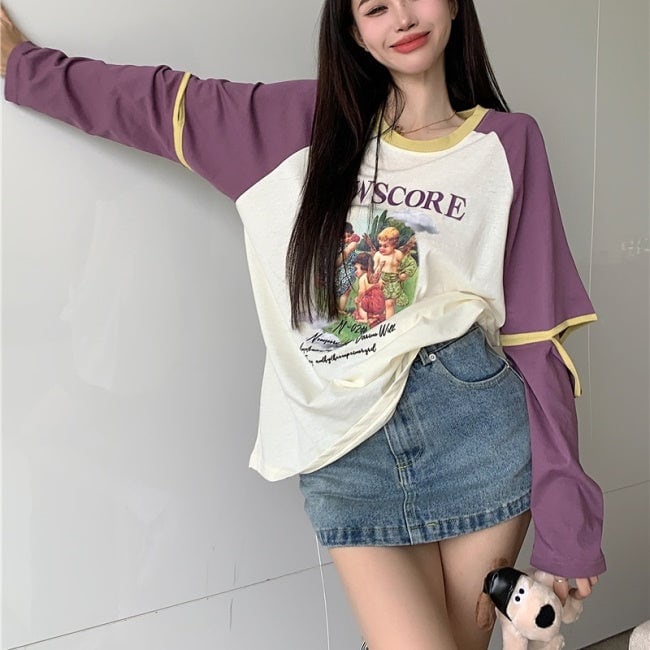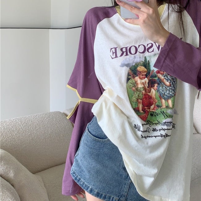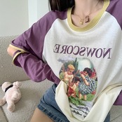 ラグラン T 夏トップス プリント ロンT 長袖 レディース パープル 韓国 ファッション かわいい ジッパー袖