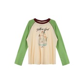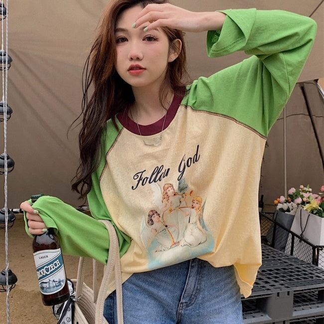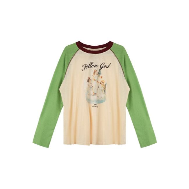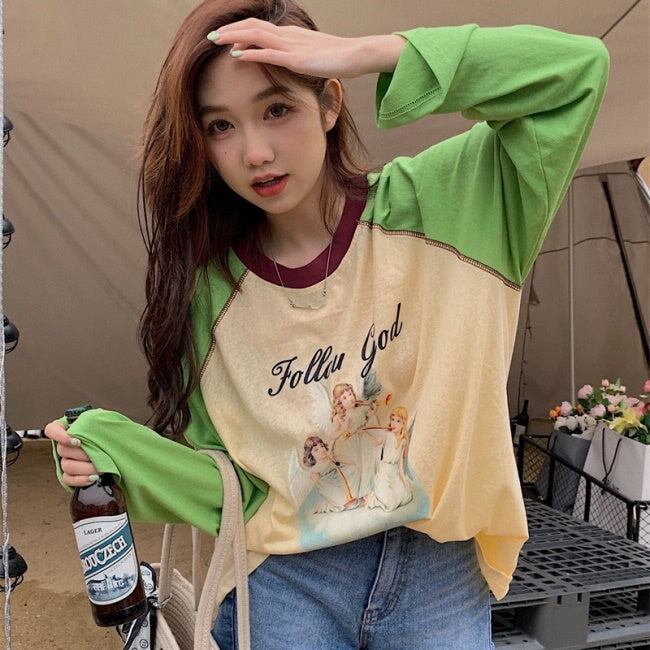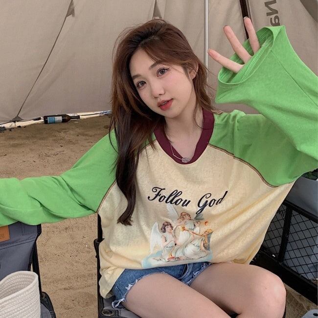Tシャツ 長袖 レディース 韓国 ファッション エンジェル プリント ラグラン ロンT グリーン 緑