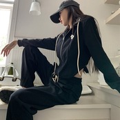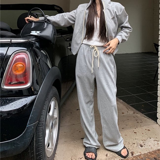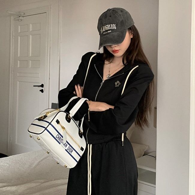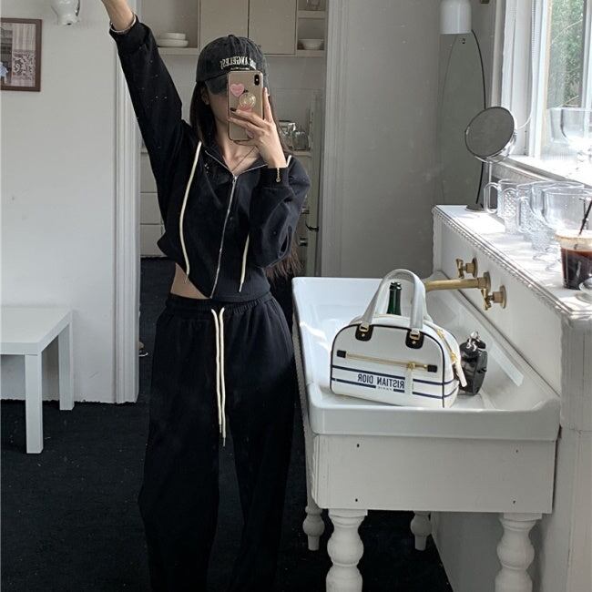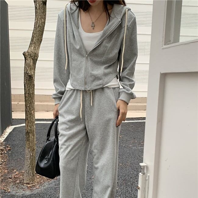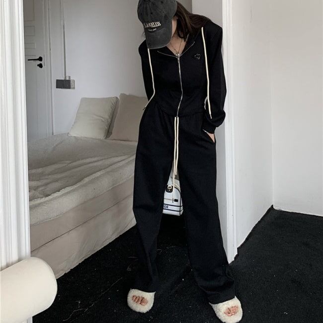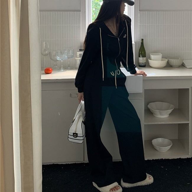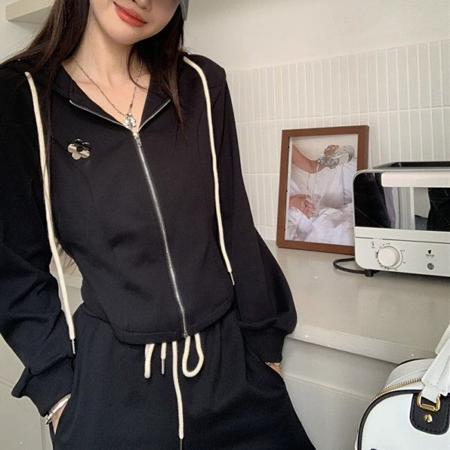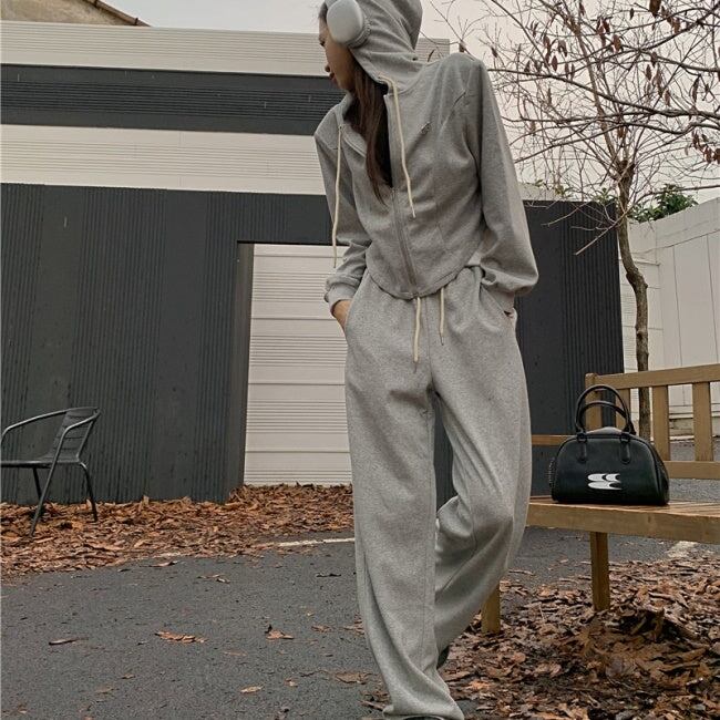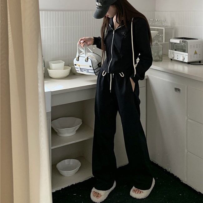 スウェット セットアップ レディース 韓国 ファッション 黒グレー 上下2点セット ワンポイント ジップパーカー ジョガーパンツ ラウンジ
