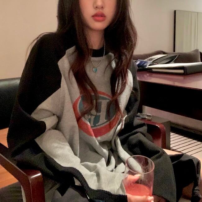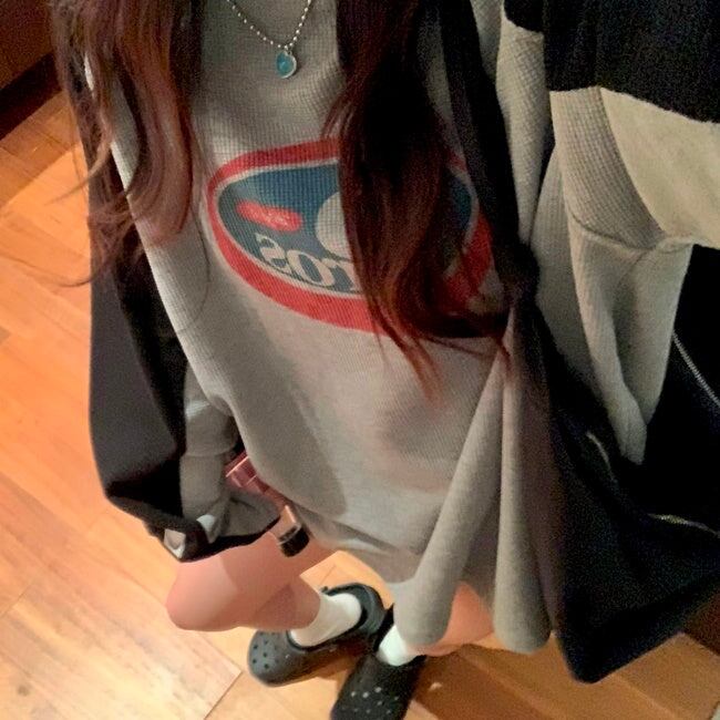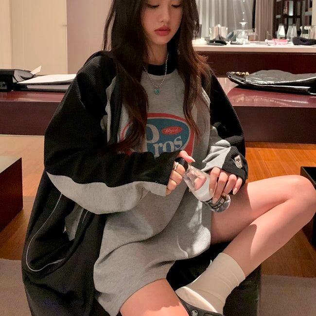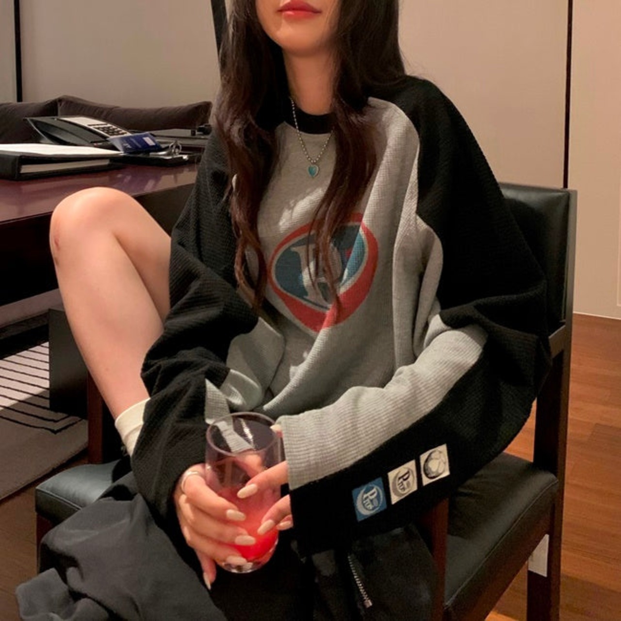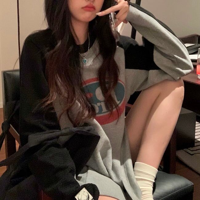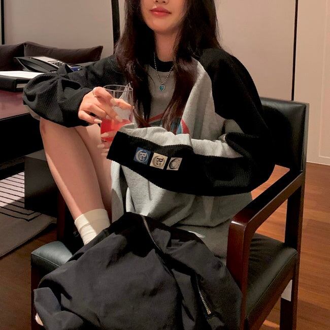 スウェット ロンT レディース 韓国 ストリート ロゴ バイカラー プリントロゴ ラグラン ロングTシャツ