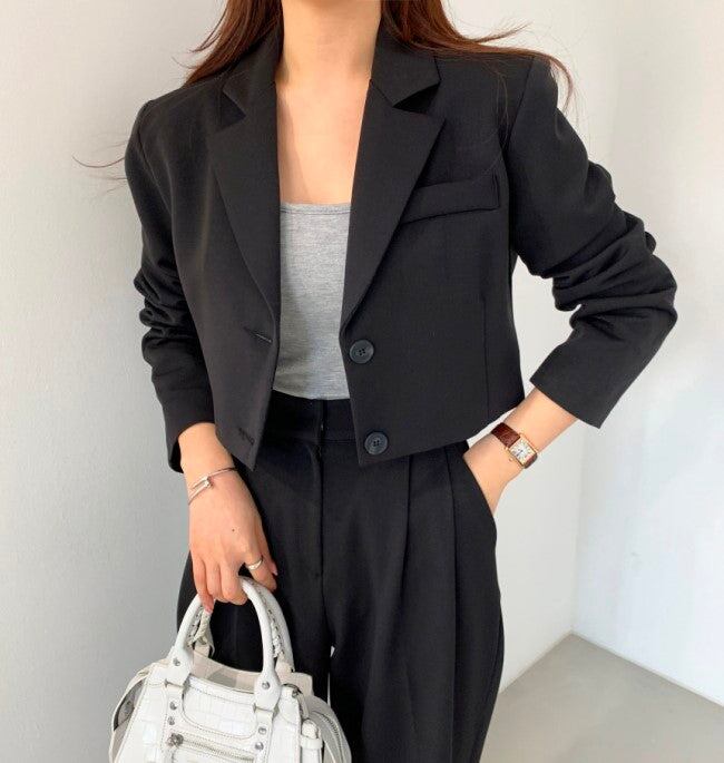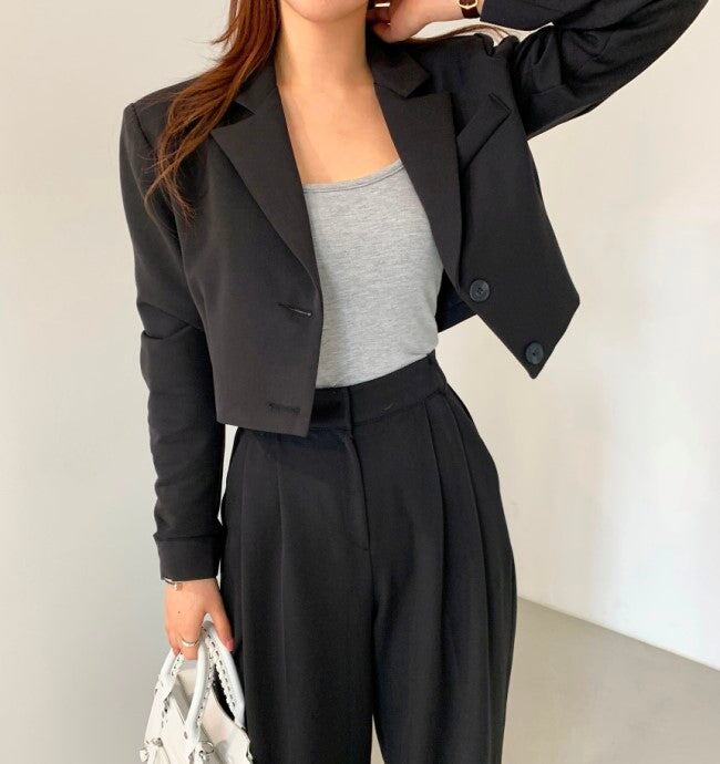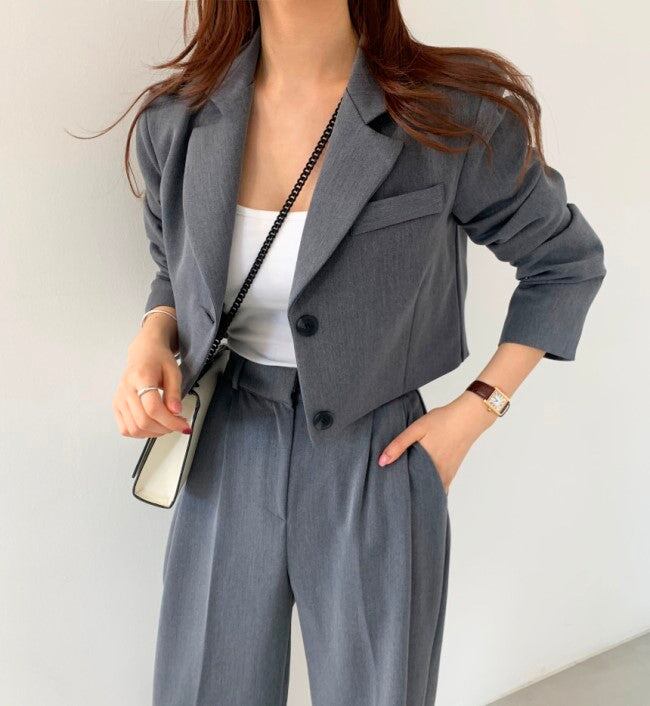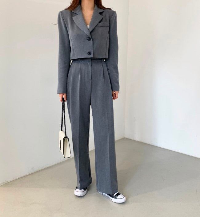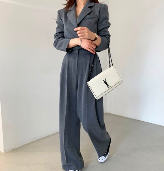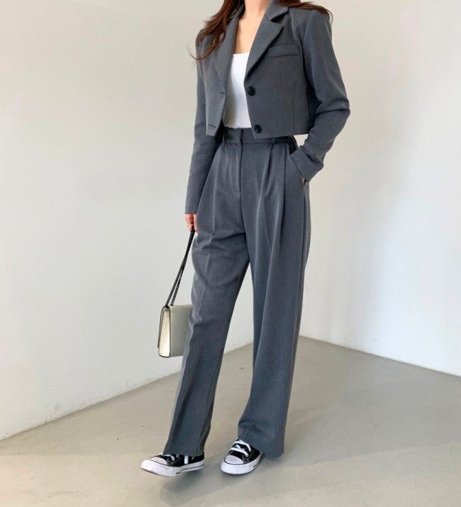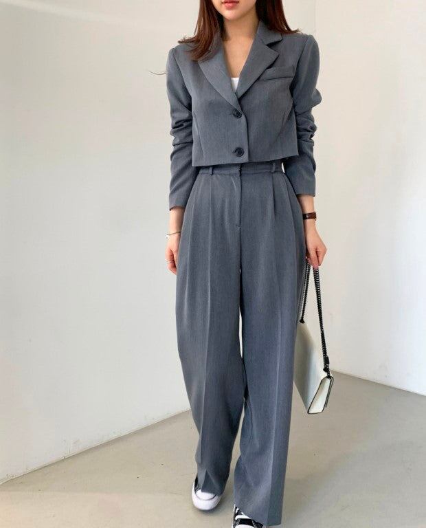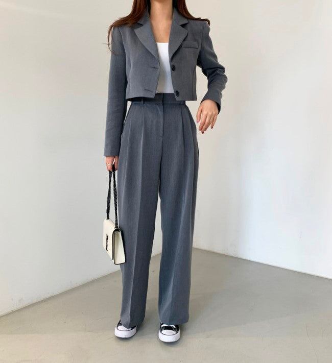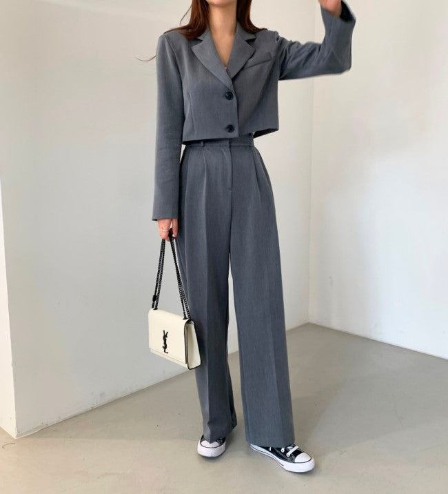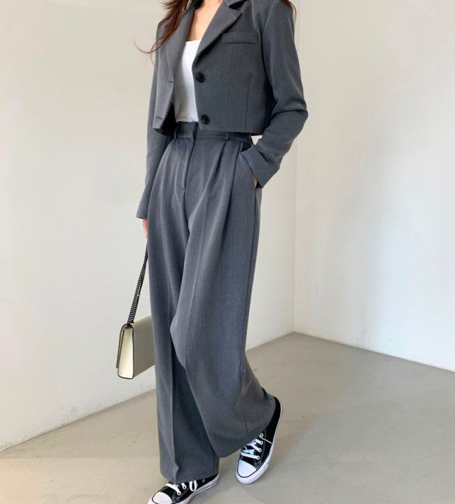 セットアップ スーツ レディース 韓国 ファッション テーラードジャケット ショート丈 ワイドパンツ タックパンツ ロングパンツ カジュアルスーツ 上下 2点セット 黒 グレー ジャケットパンツ パンツスーツ