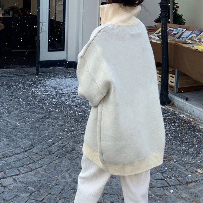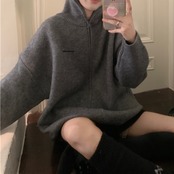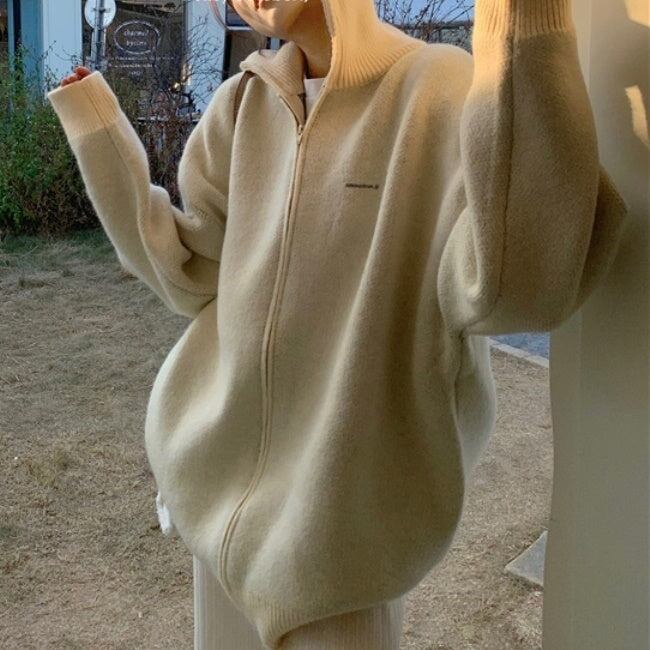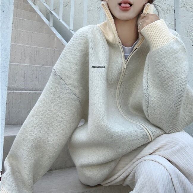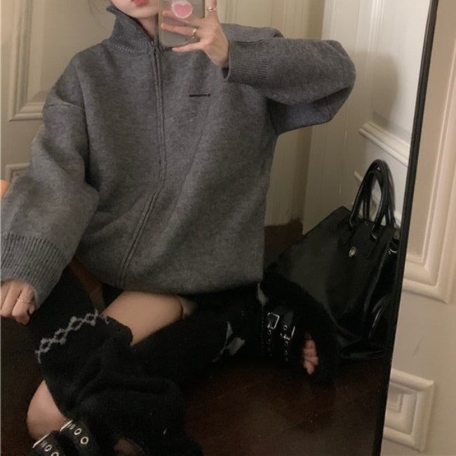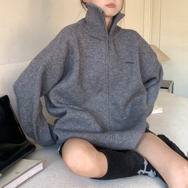 ハイネック ニット ジャケット レディース 韓国 ジップアップ オーバーサイズ ニットトップス 秋冬
