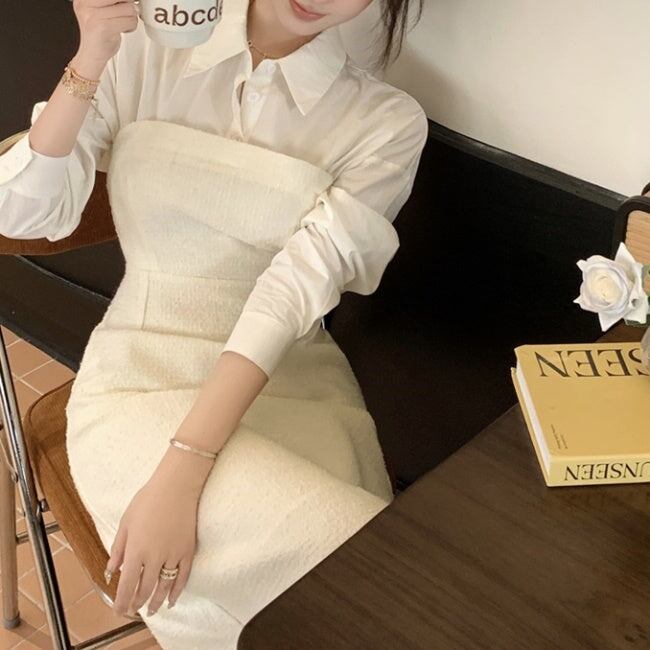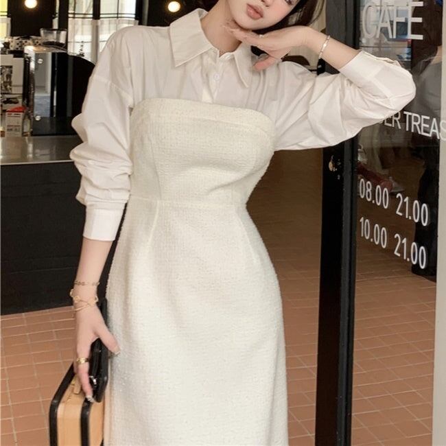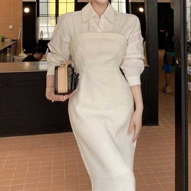 フェイクレイヤード ワンピース 切り替え レディース 韓国 ファッション ドッキングワンピース 白シャツ チューブドレス 白ドレス ワンピース シャツワンピース