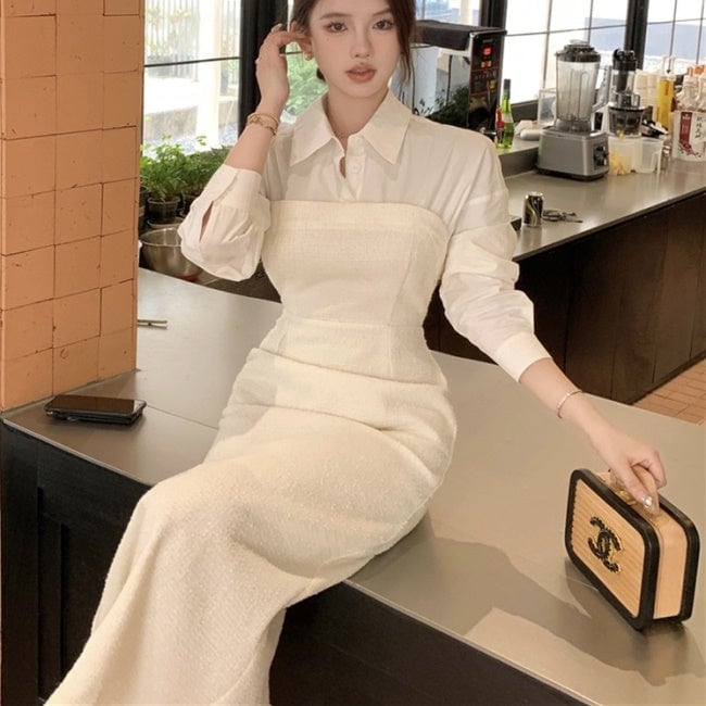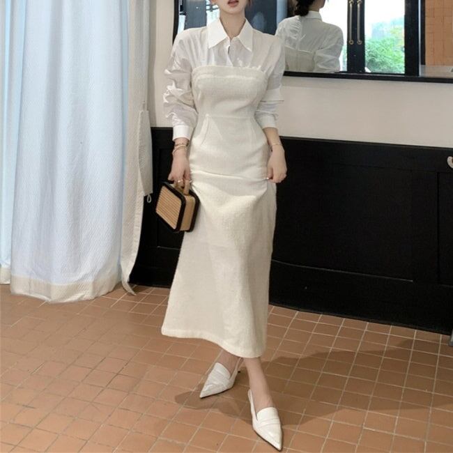 レイヤード ロングワンピース レディース 韓国 ファッション シャツ 切替 ドッキングワンピース きれいめ 白 ドレスワンピ