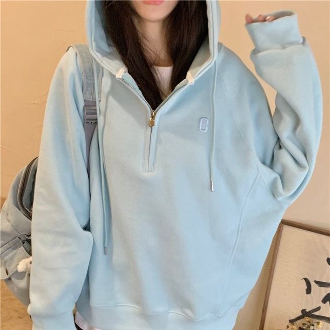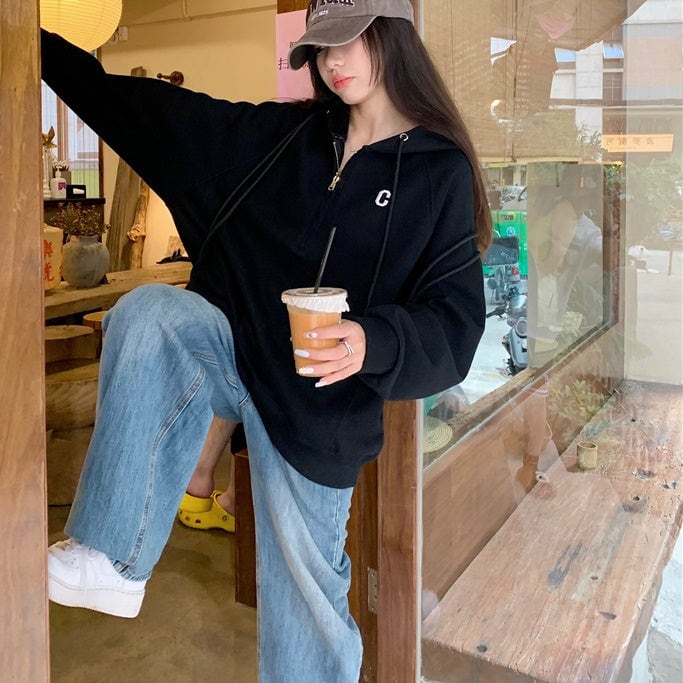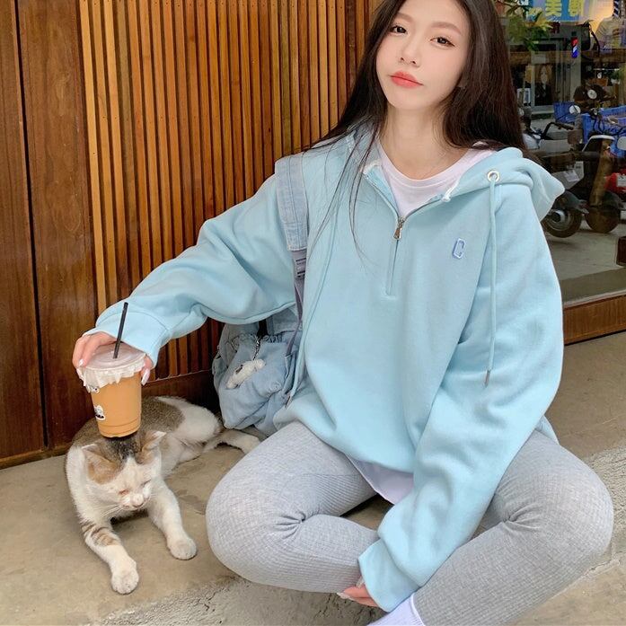 ハーフジップ パーカー レディース 韓国 ファッション ロゴ ビッグシルエット スウェット パーカー 秋冬