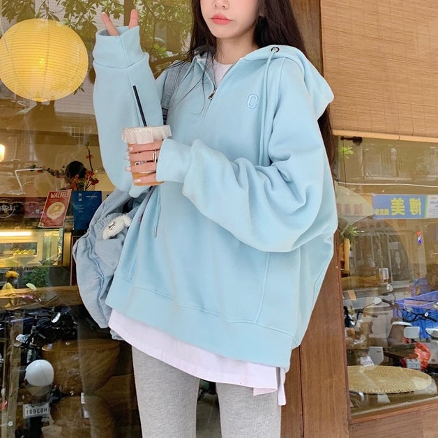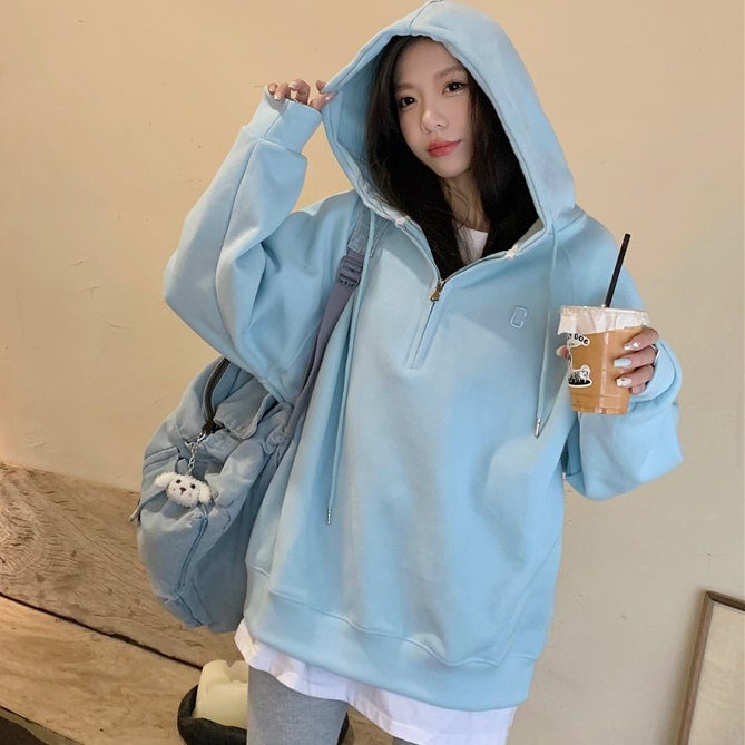 パーカー レディース 韓国 ファッション ハーフジップ ビッグパーカー オーバーサイズ 裏フリース 厚手 秋冬 トップス 厚手 スポーツミックス 大人カジュアル