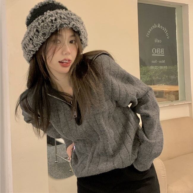 ハーフジップ ニット レディース 韓国 ファッション 長袖 秋冬 トップス おしゃれ バイカラー 毛足ながめ セーター
