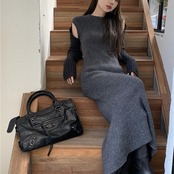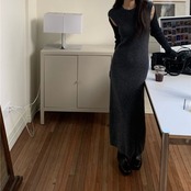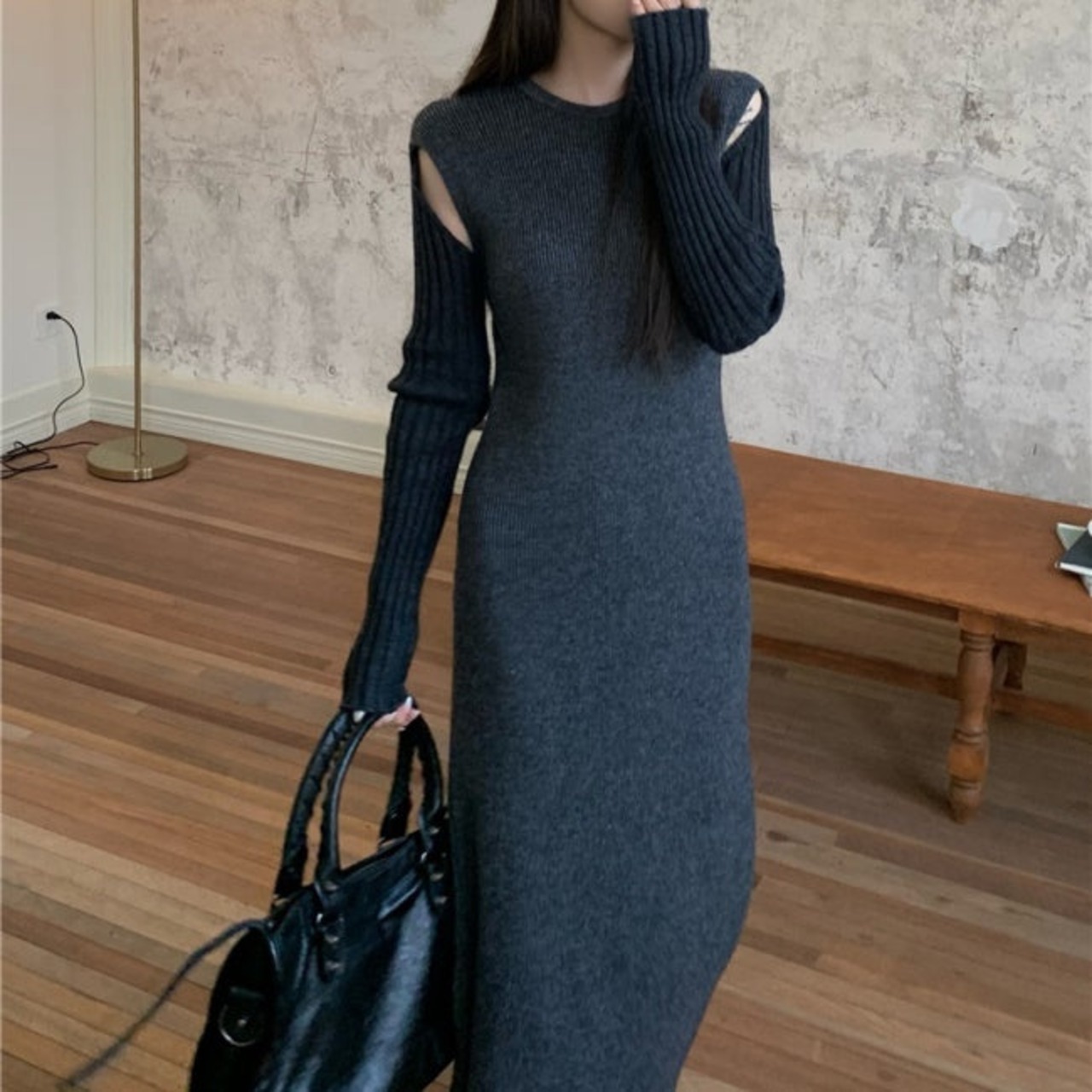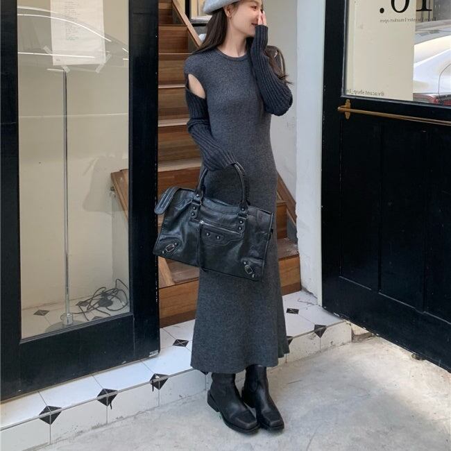ノースリーブ ニットワンピース ロング レディース 韓国 ファッション 袖コンシャス 長袖 ストレッチ ロングワンピース