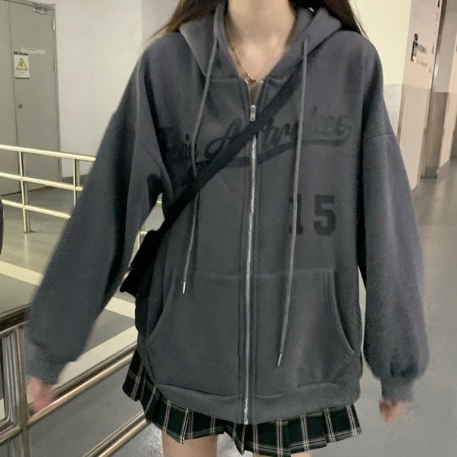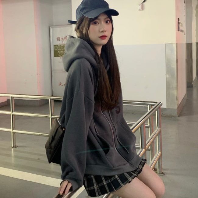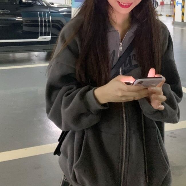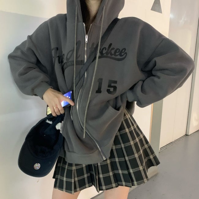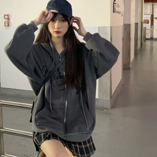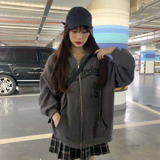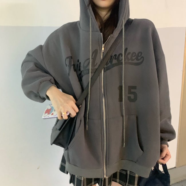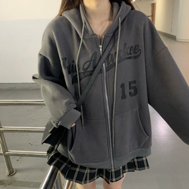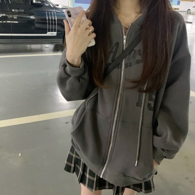 ロゴ ジップパーカー レディース 韓国 ファッション メンズライク フードパーカー グレー ビンテージ加工 アッシュグレー