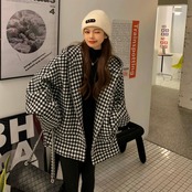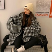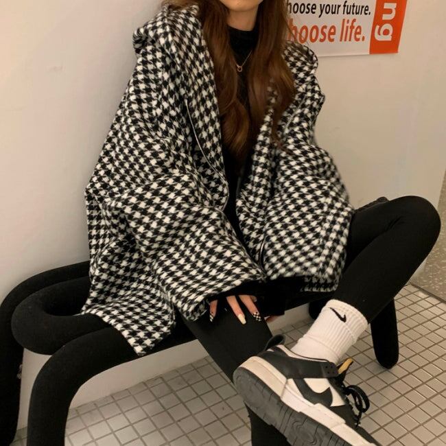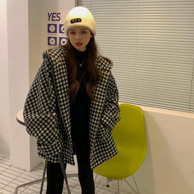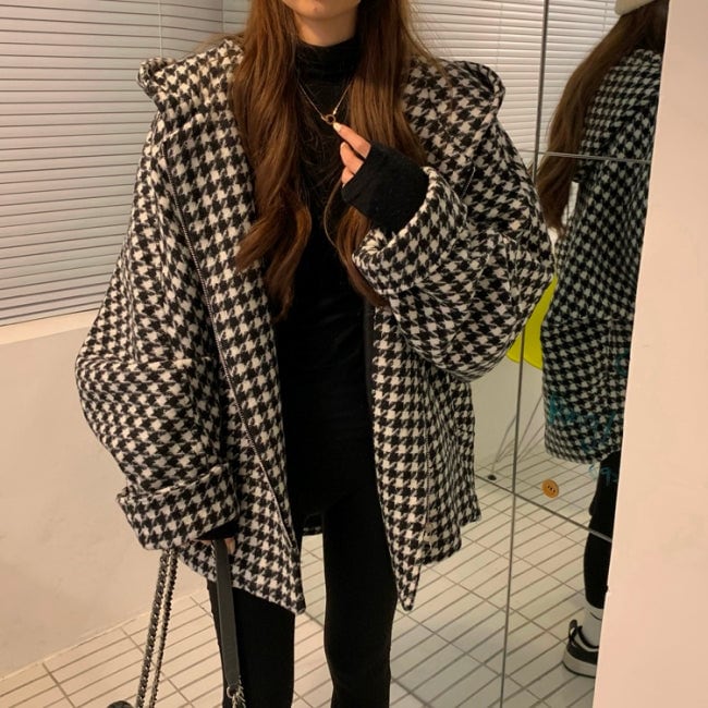 チェック フード ジャケットコート レディース 韓国 ファッション 冬 千鳥 ギンガムチェック オーバーサイズ パーカージャケット