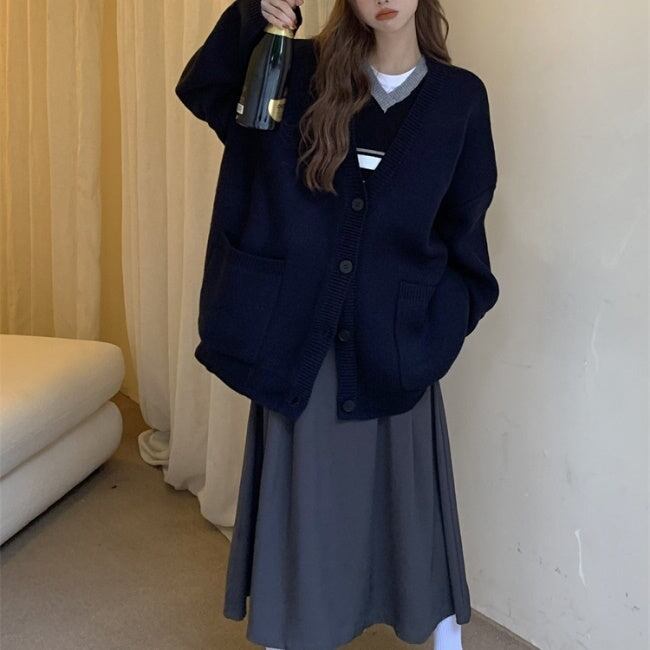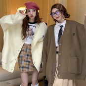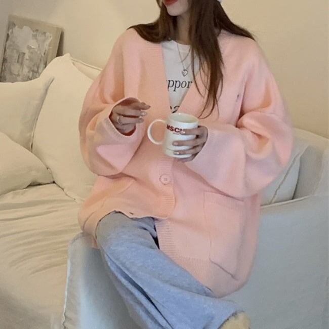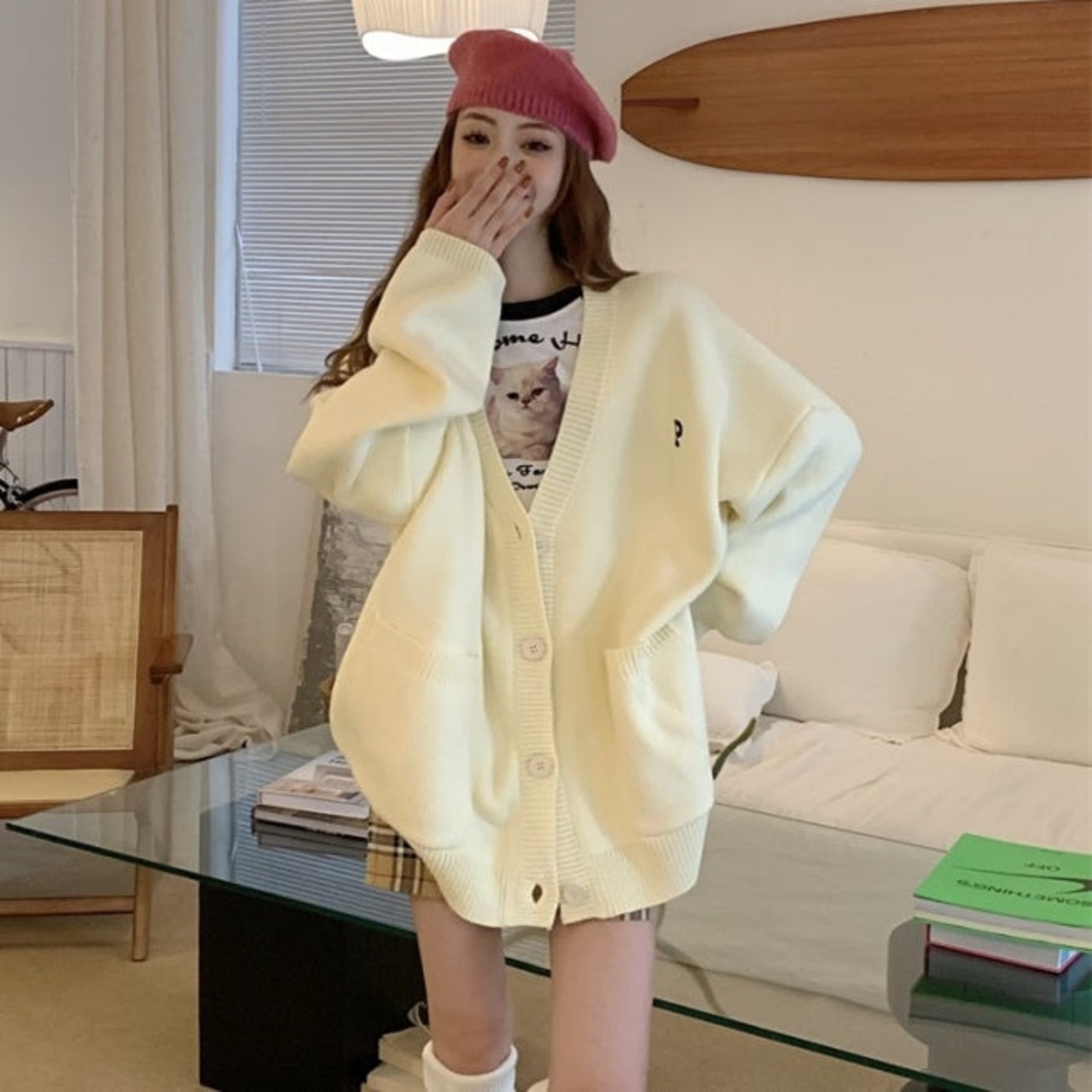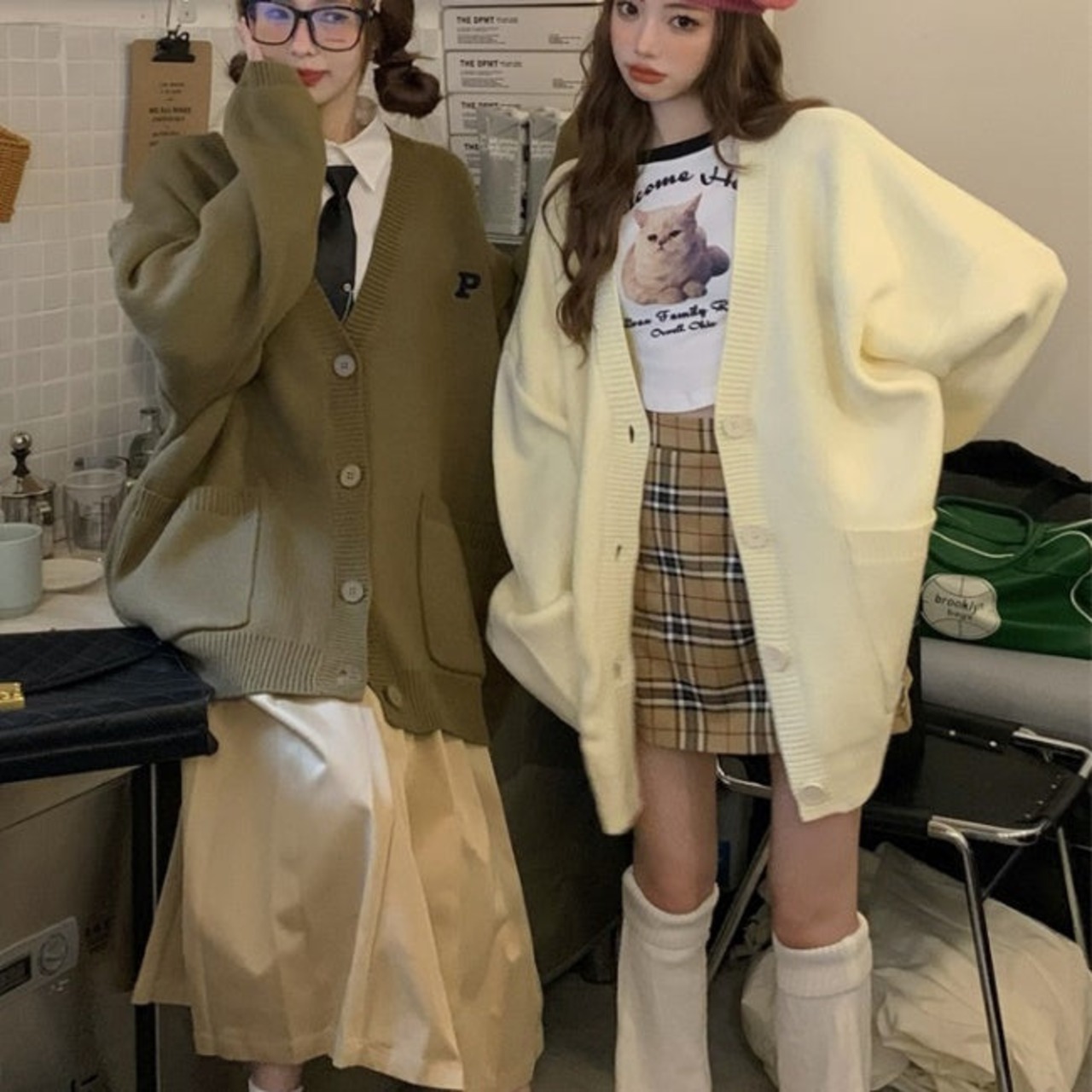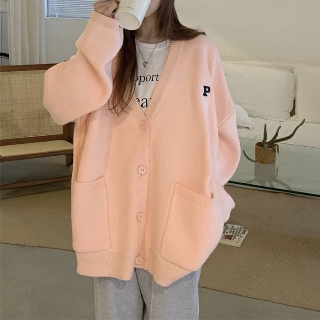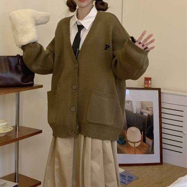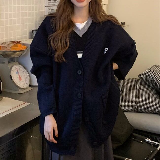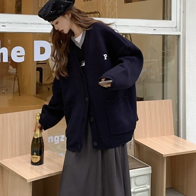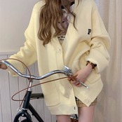ニット カーディガン レディース 韓国 ファッション ビッグシルエット オーバーサイズ ワンポイント ビッグサイズ 春トップス プレッピー ゆったり