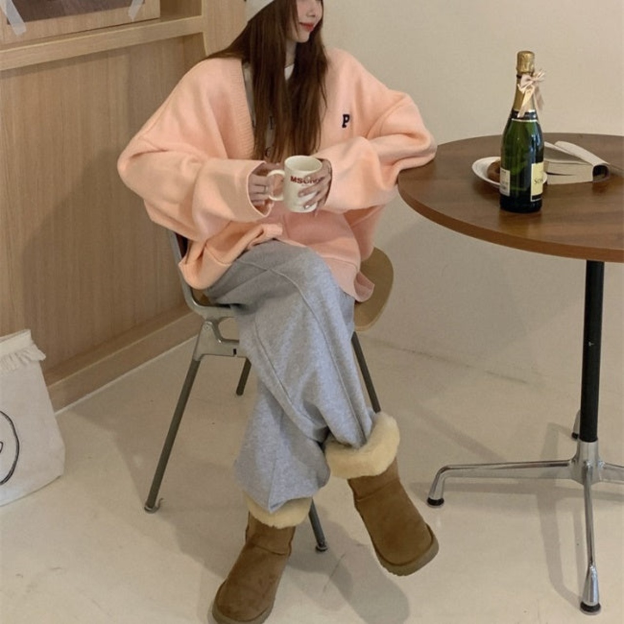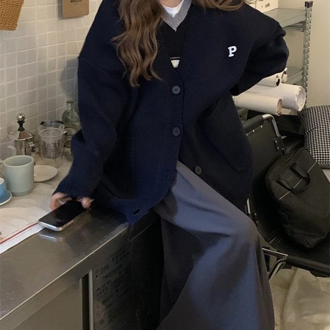 オーバーサイズカーディガン レディース 韓国 ファッション ビッグシルエット ワンポイント ロゴ ニット カーディガン