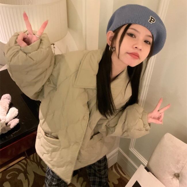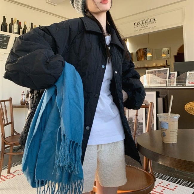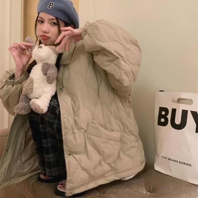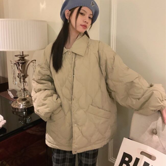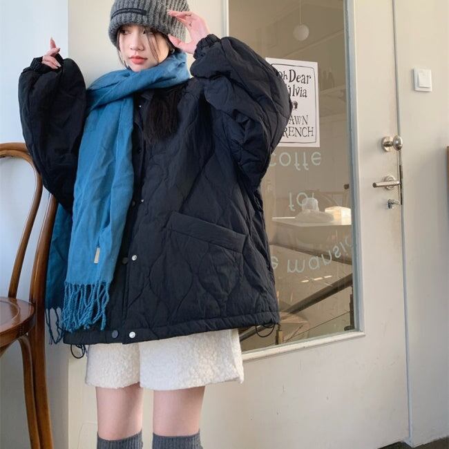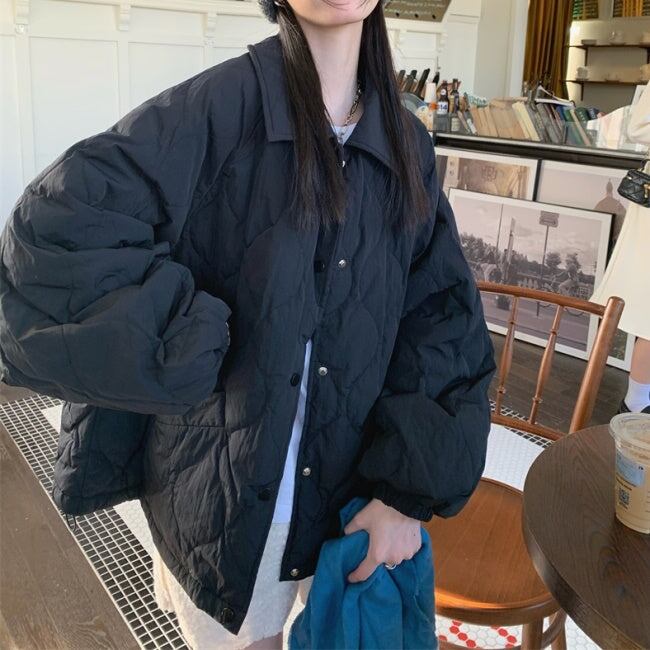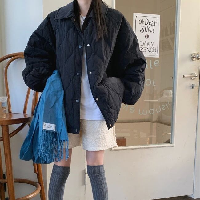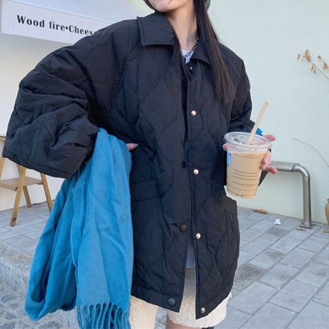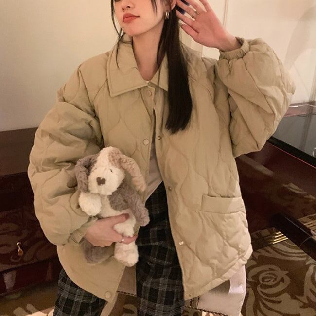 キルティングジャケット レディース 韓国 ファッション ひょうたん柄 ステッチ 黒 ベージュ 中綿 ボタン アウター ジャケット ブルゾン オーバーサイズ 大人カジュアル