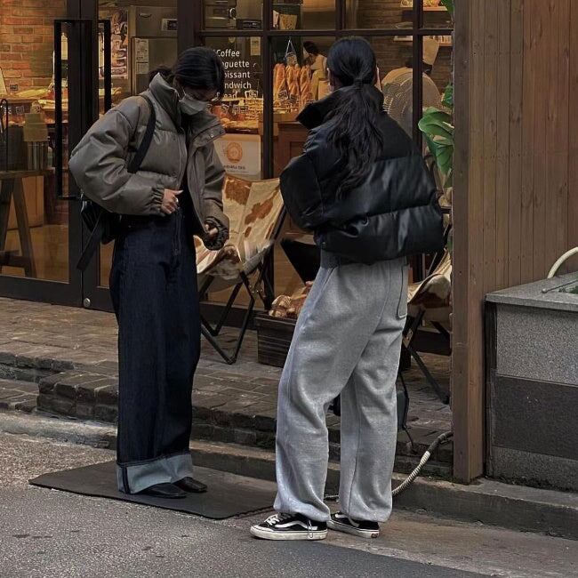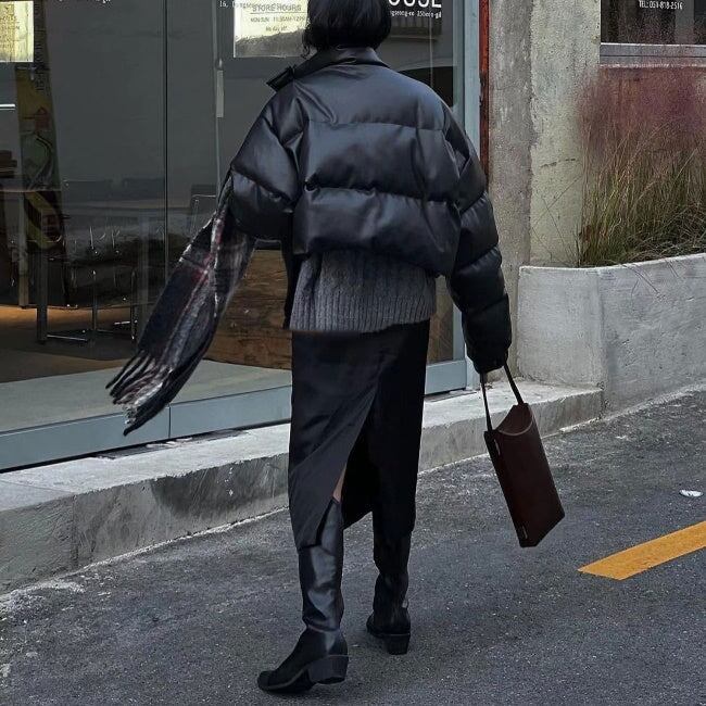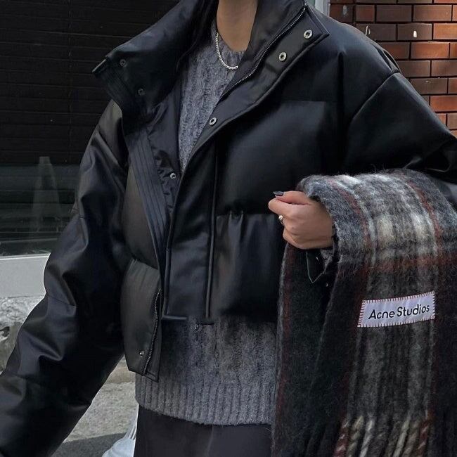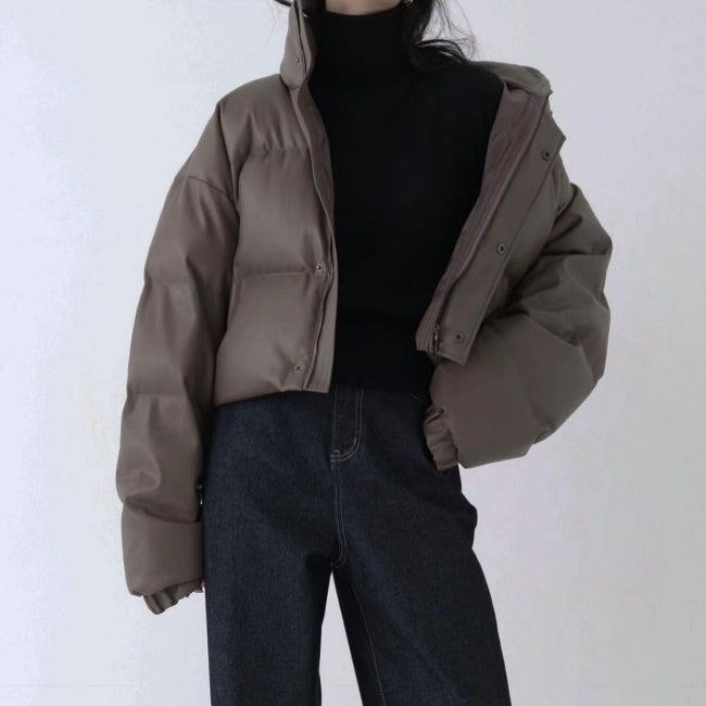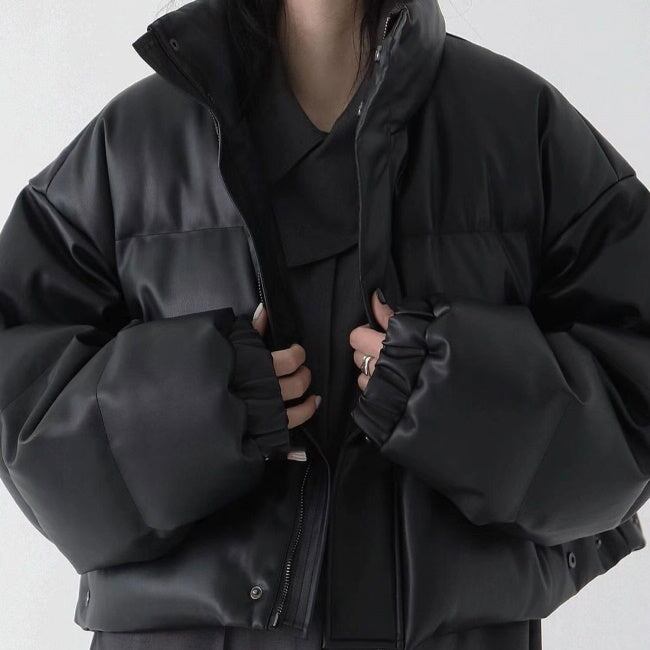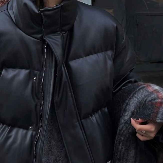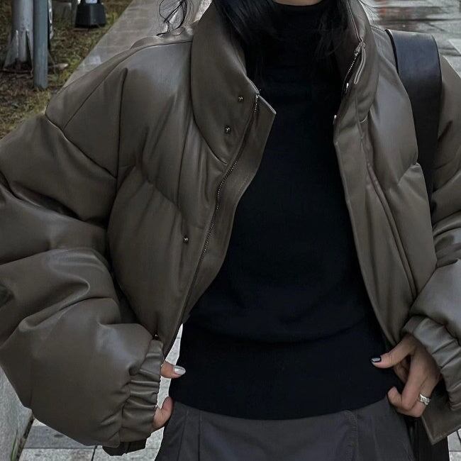 エコ レザーダウンジャケット クロップド レディース 韓国 ファッション ショート丈 PUレザー 中綿 ボリューム ジャケット
