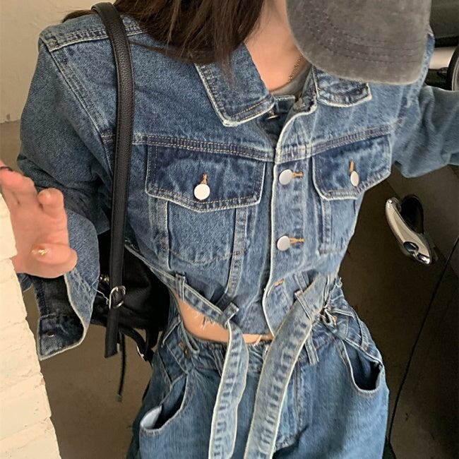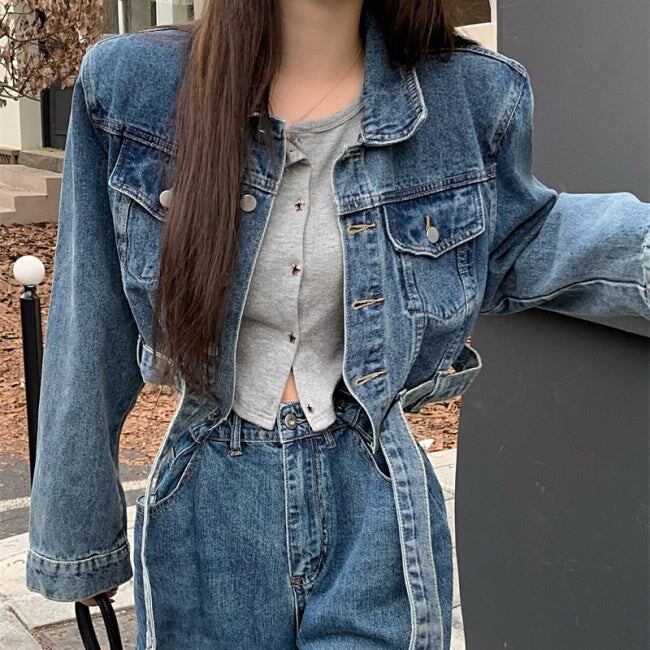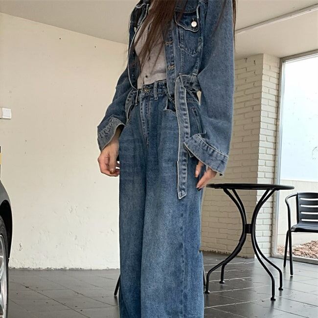 デニム セットアップ レディース 韓国 ファッション デニムワイドパンツ クロップド デニムジャト 上下セット 秋冬