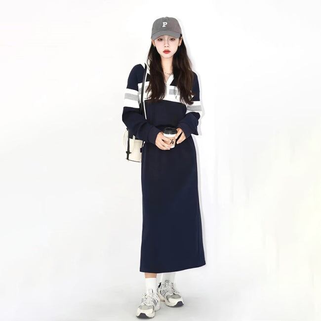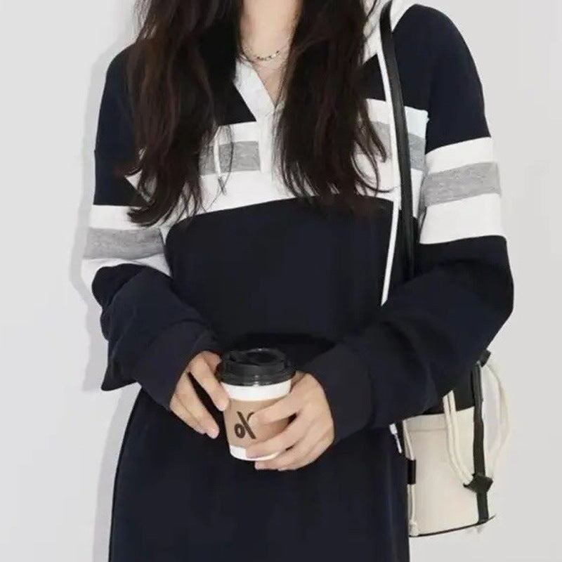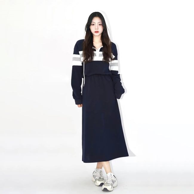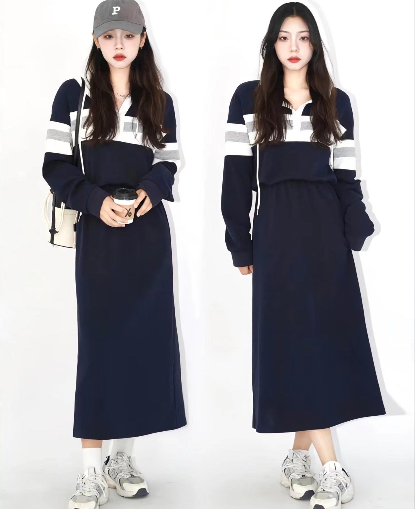 ポロシャツワンピース ボーダー レディース 韓国 ファッション ロング 長袖 春ワンピ バイカラー カラーブロック Aライン スポーティ ハイウエスト スウェット ワンピース