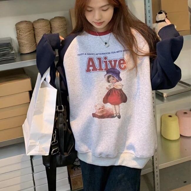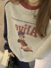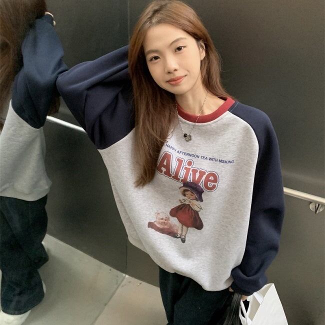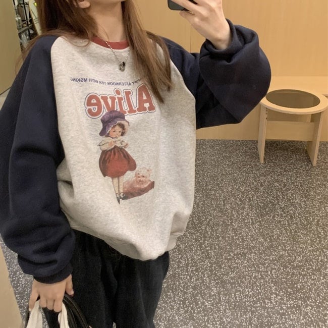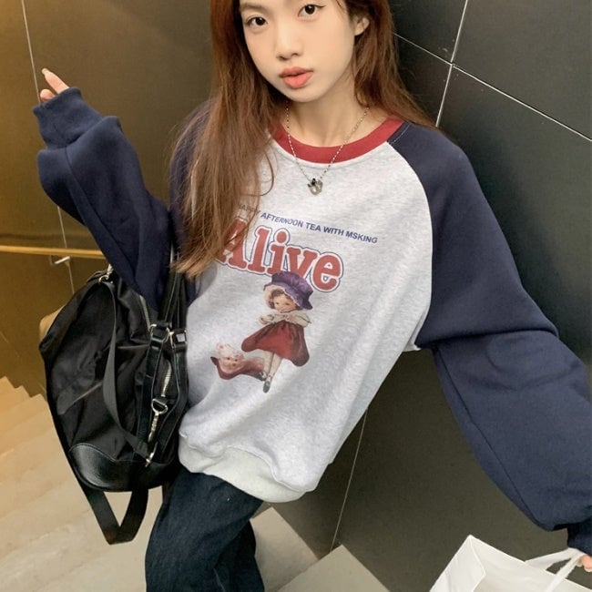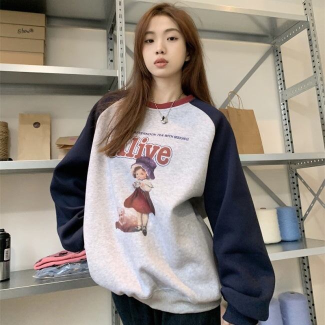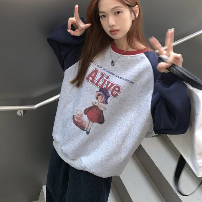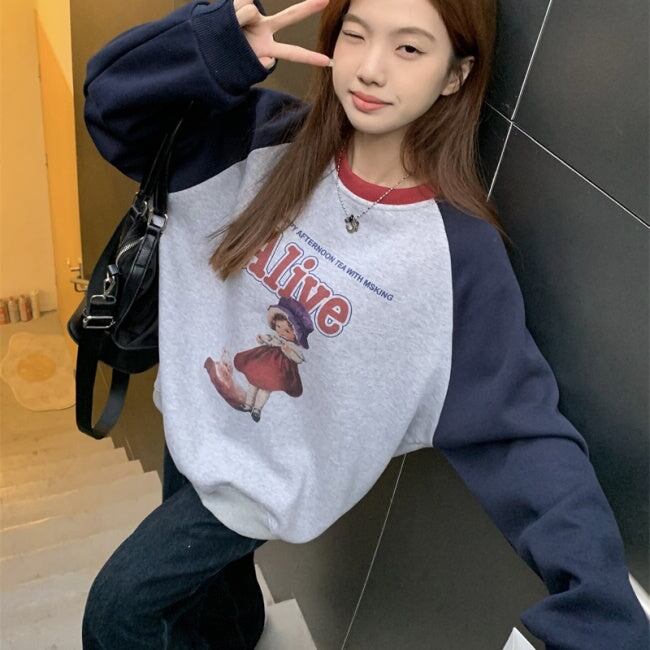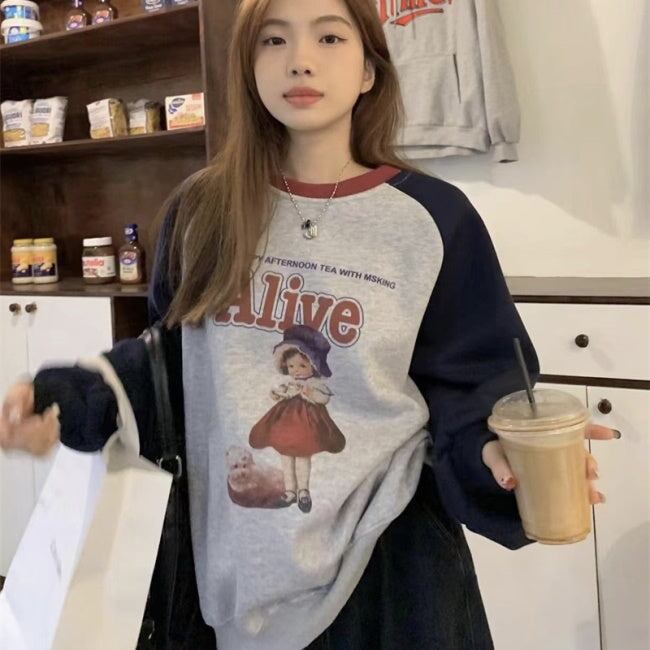 プリント ラグラン トレーナー レディース 韓国 ファッション オーバーサイズ ロゴ キャラクター プリント バイカラー スウェット シャツ