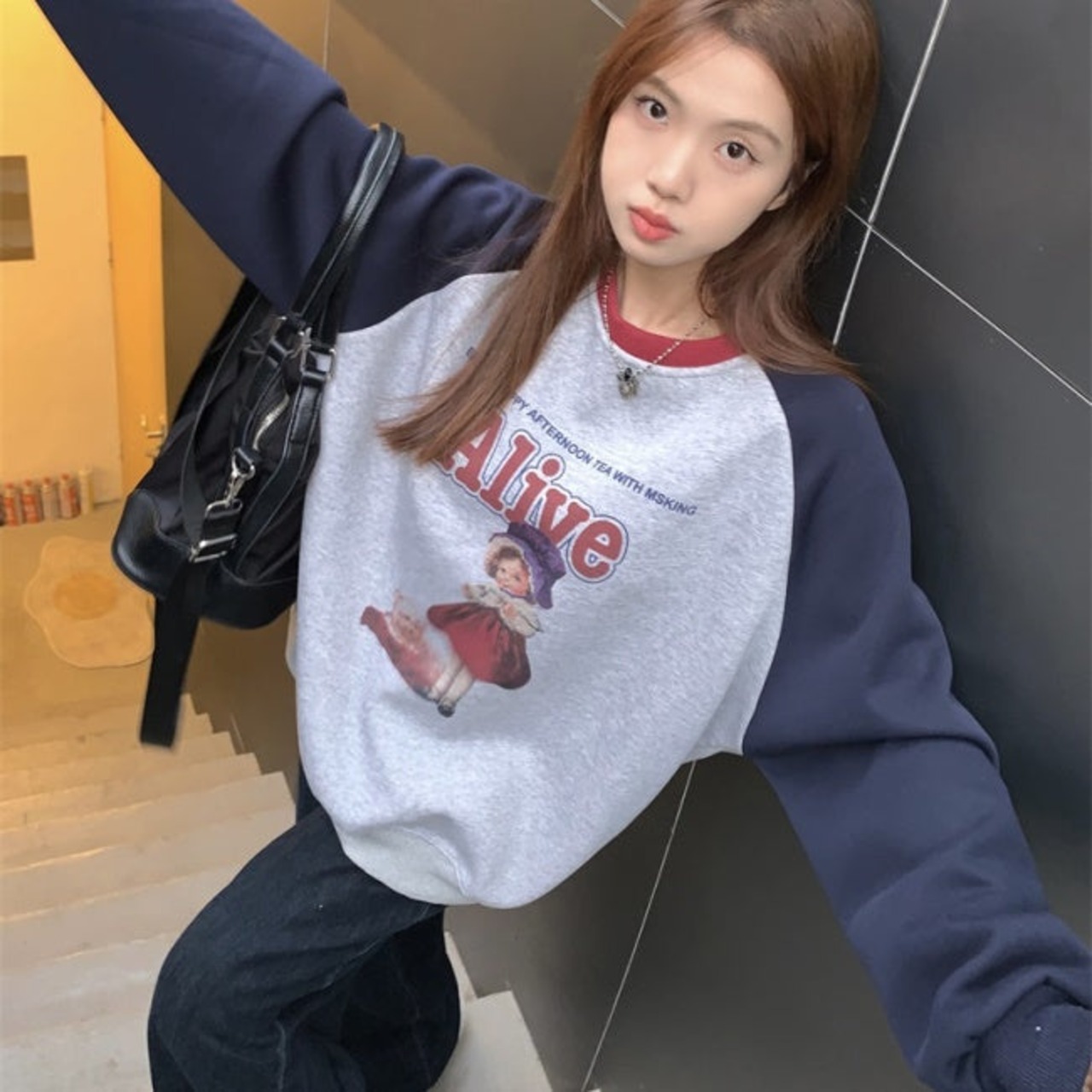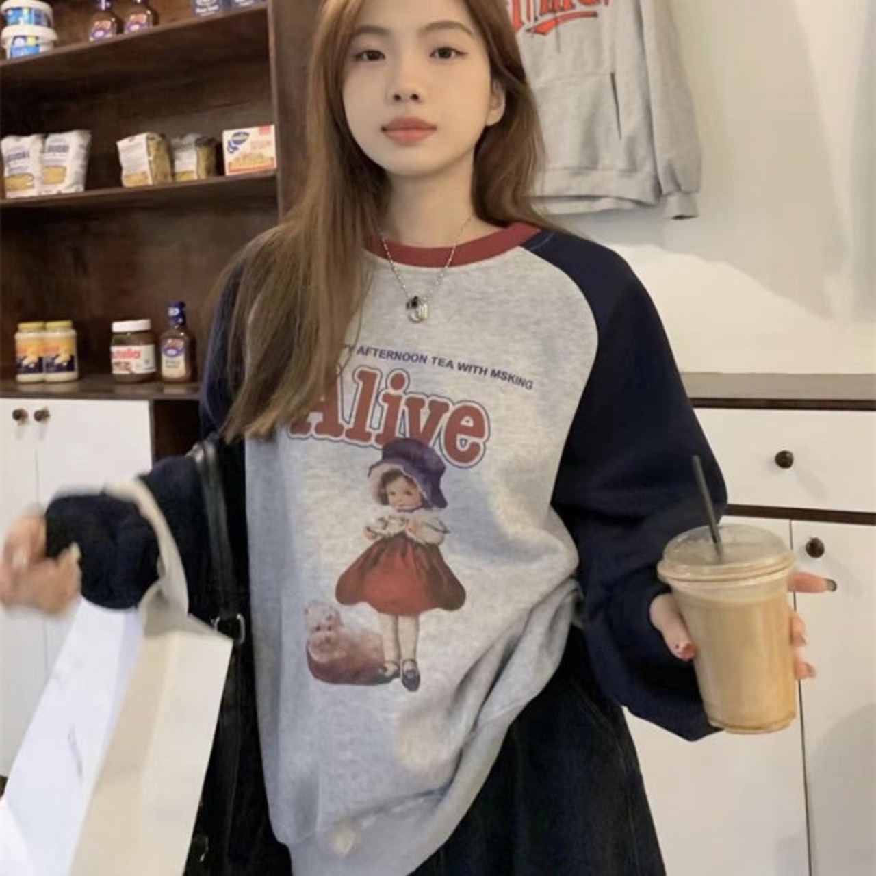 トレーナー レディース 韓国 ファッション キャラクター プリント バイカラー ラグランスリーブ レトロ