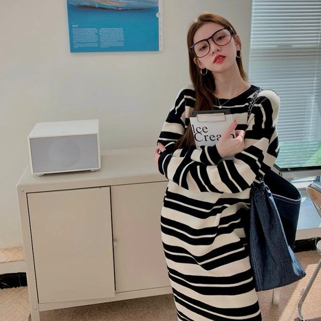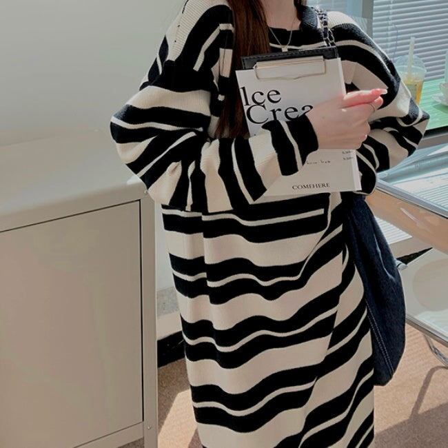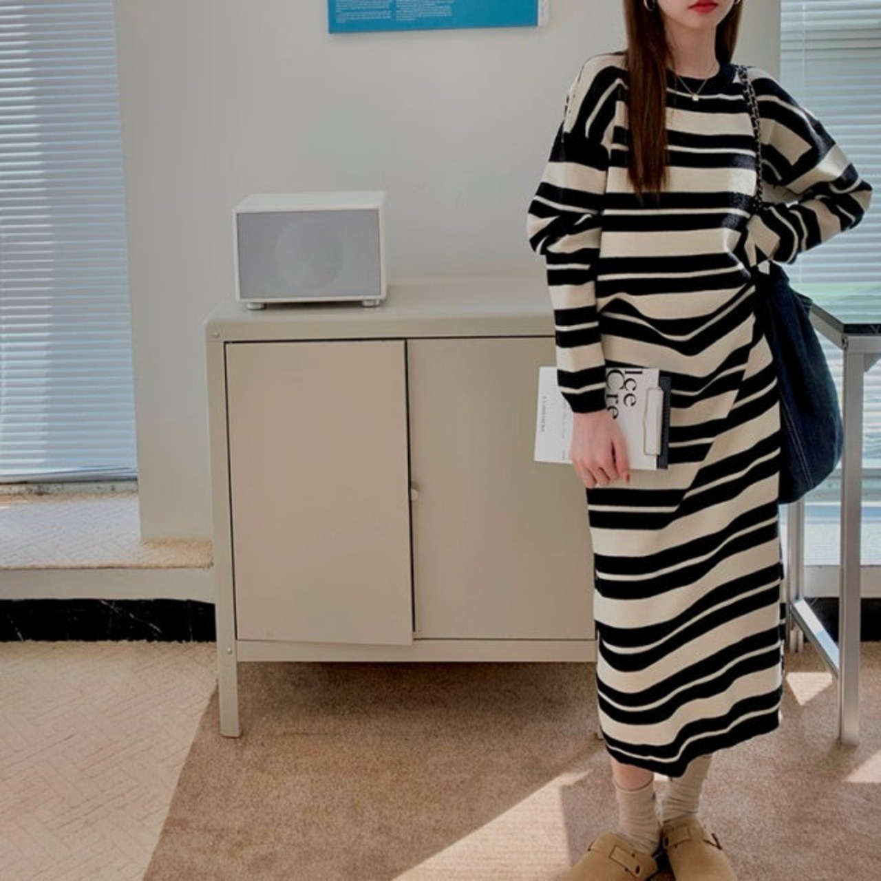 ボーダー ロングワンピース レディース 韓国 ファッション リブカットソー 長袖 春 オーバーサイズ ゆったりワンピ