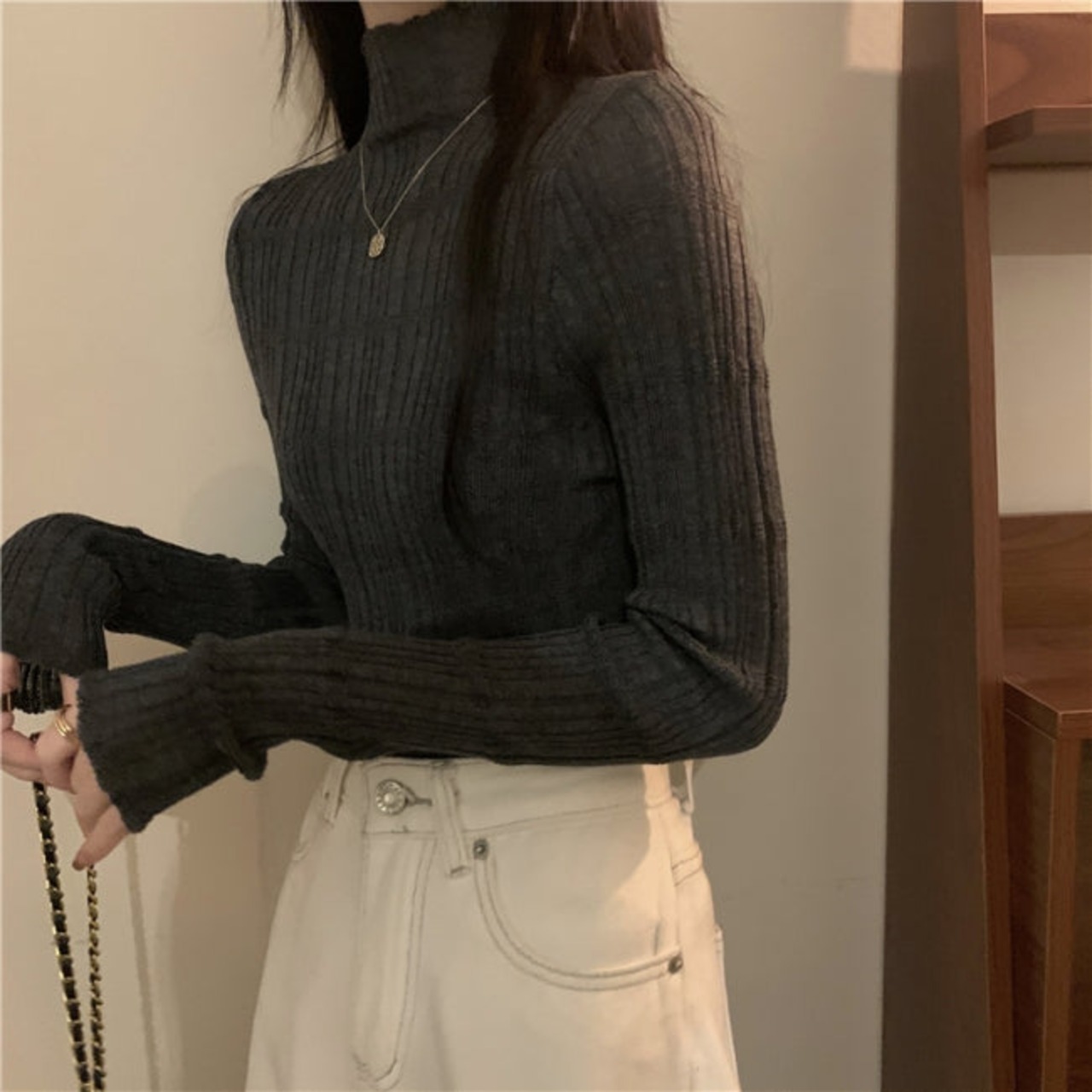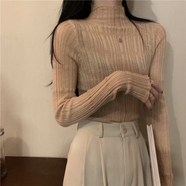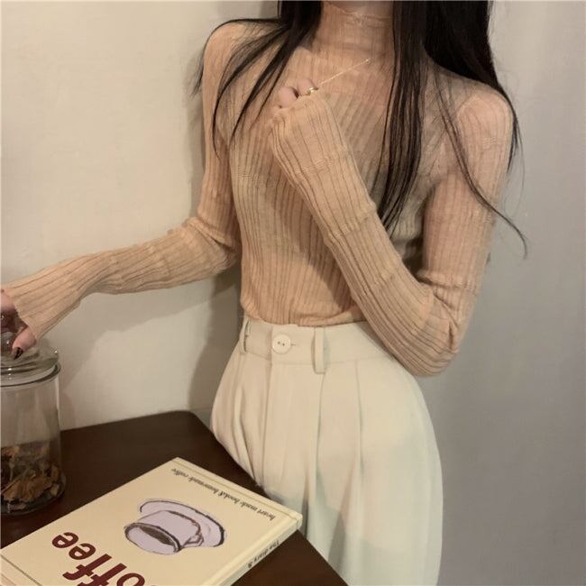 ハイネック ニット トップス レディース ローゲージ リブニット ストレッチ ニットソー 韓国 ファッション 春ニット