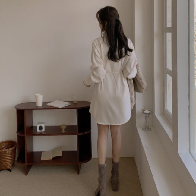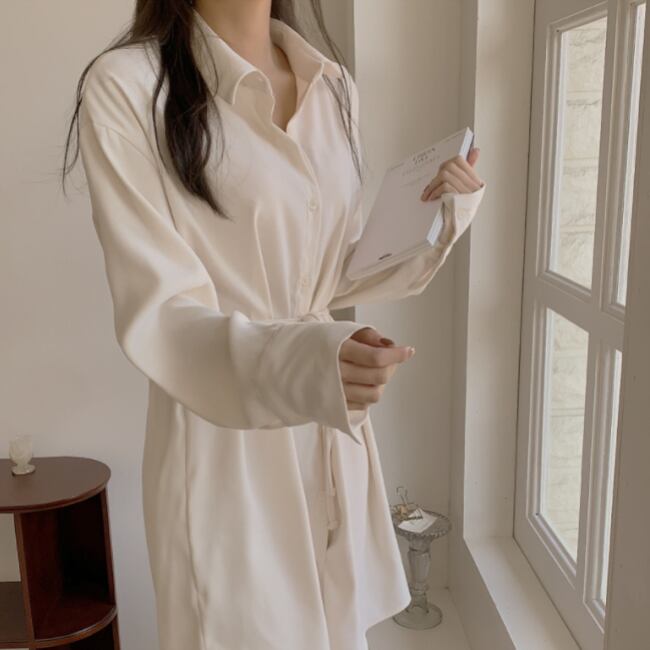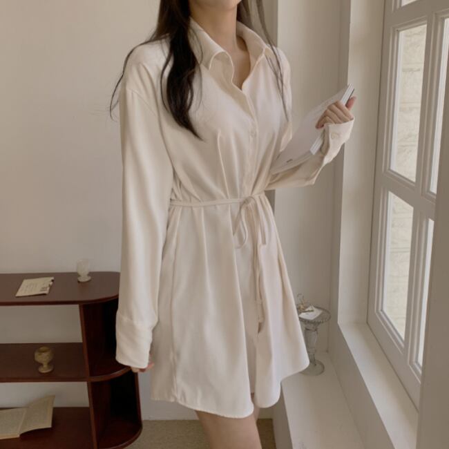 シャツワンピース レディース 韓国 ファッション 白ワンピ ウエストリボン 清楚 レイヤード 春秋 長袖 ワンピース