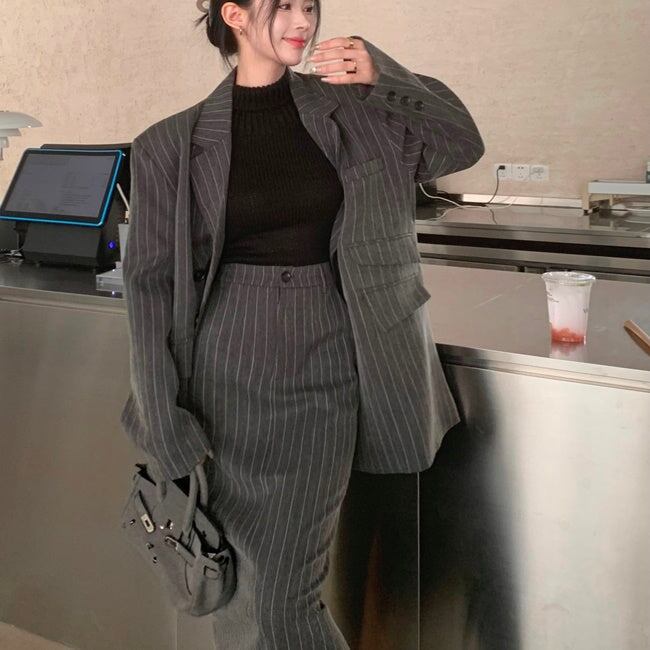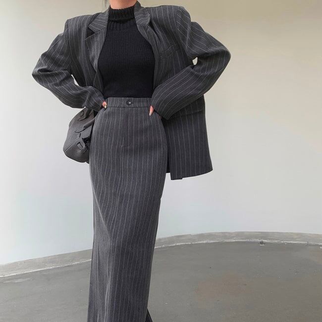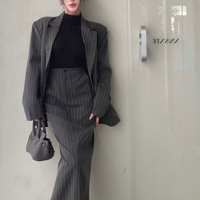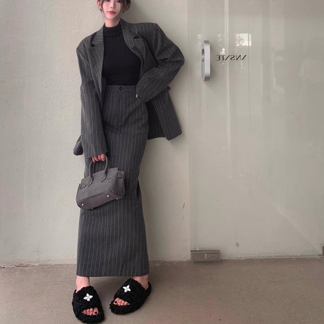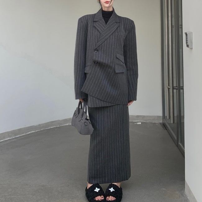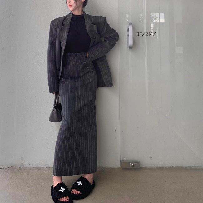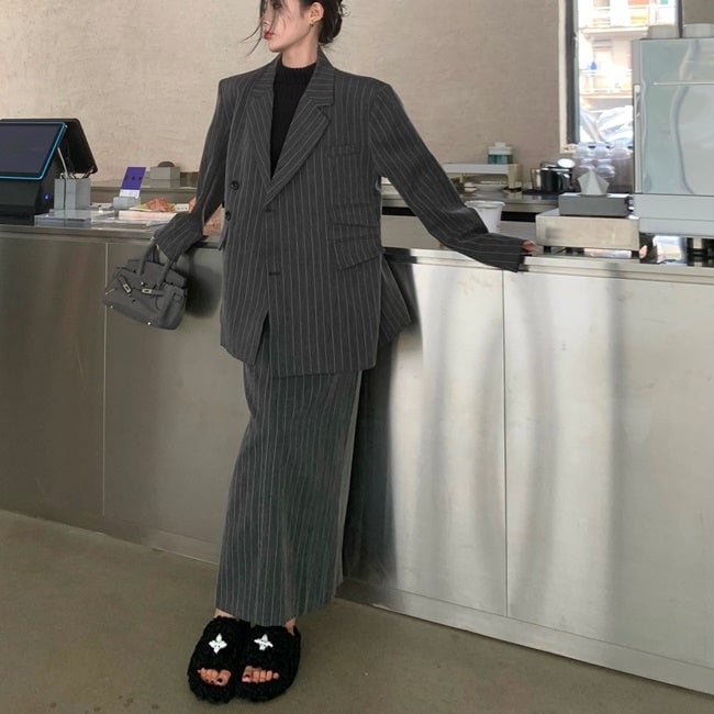 ジャケット セットアップ ロングスカート レディース 韓国 ファッション テーラードジャケット ストライプ 上下セット