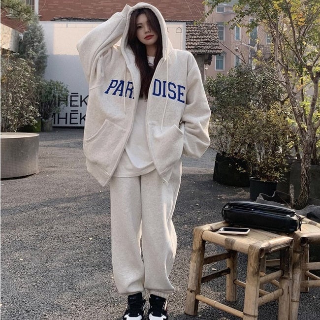 スウェット セットアップ パーカー レディース 韓国 ファッション ジョガーパンツ スウェットパンツ ジップパーカー ロゴ アップリケ 2点セット ツーピース