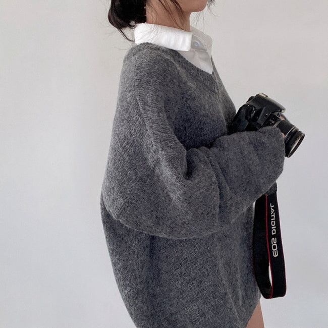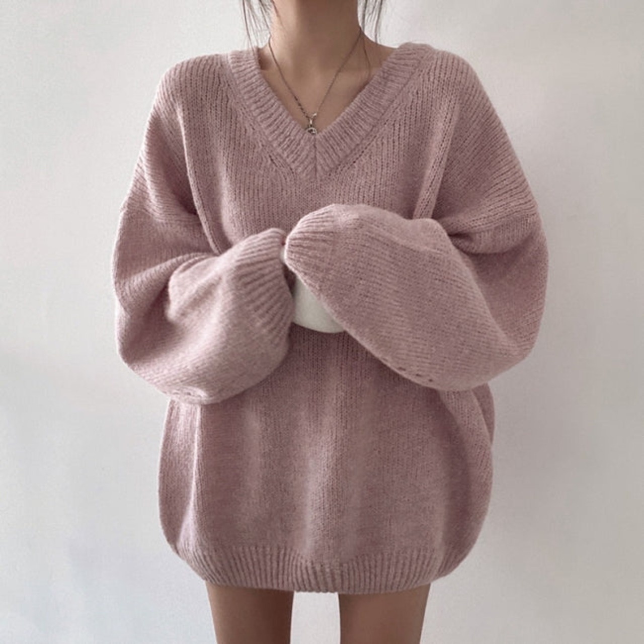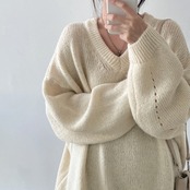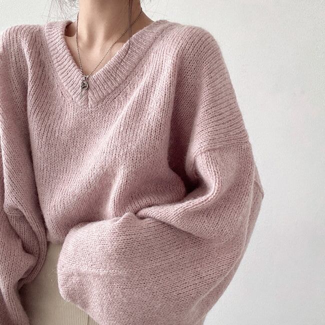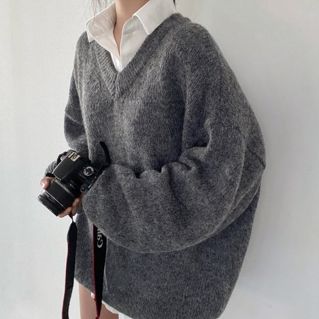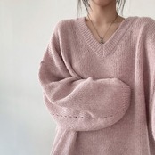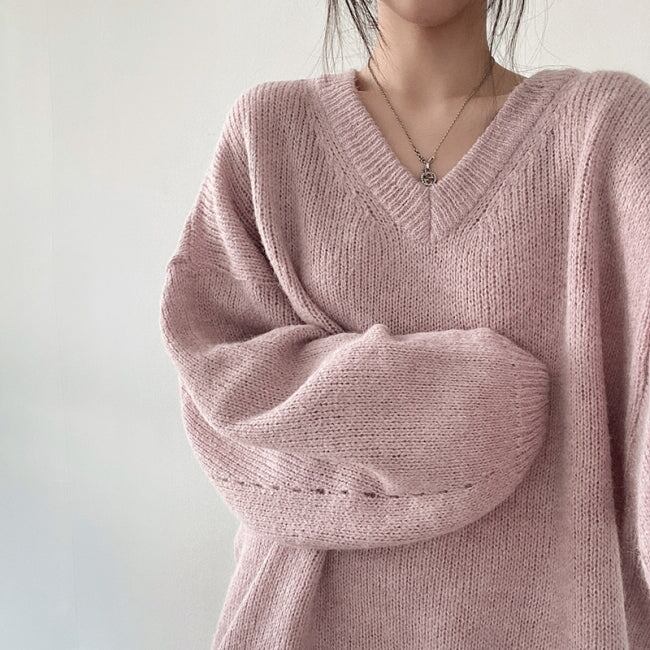 Vネック ニット オーバーサイズ レディース 韓国 ファッション ビッグシルエット 秋冬 厚手ニット ボリューム袖 シンプル ベーシック プレッピー デコルテ 無地