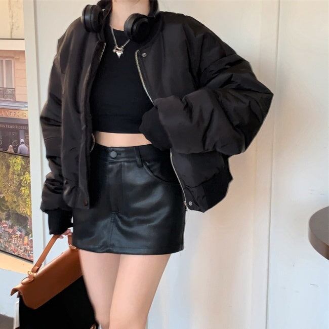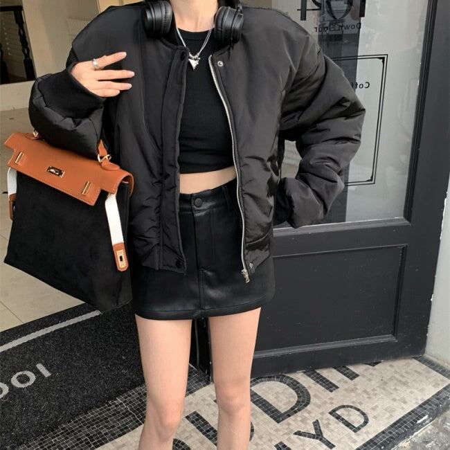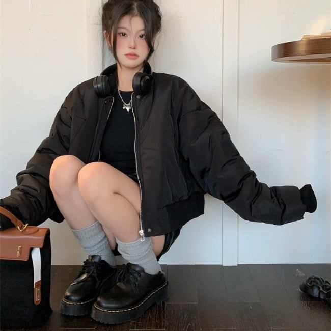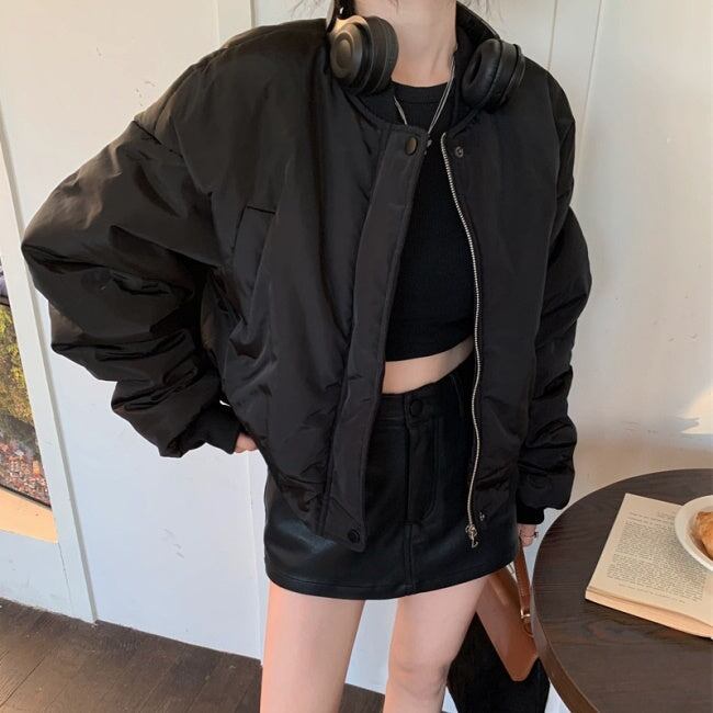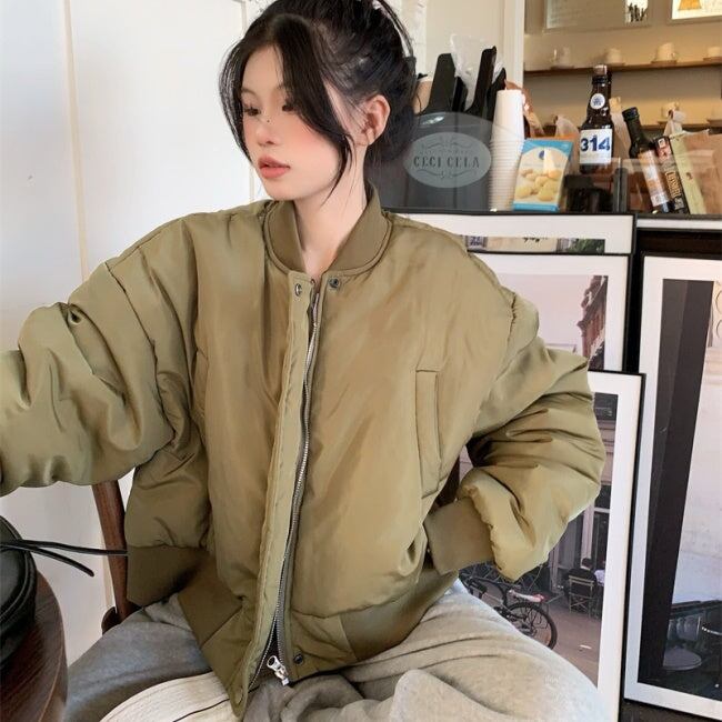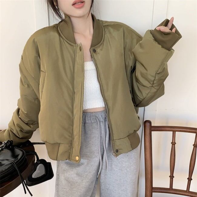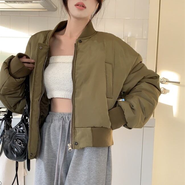 中綿 ブルゾン カーキ 黒 レディース 韓国 ファッション オーバーサイズ 中綿 ジップジャケット 暖かい 冬アウター ショート丈