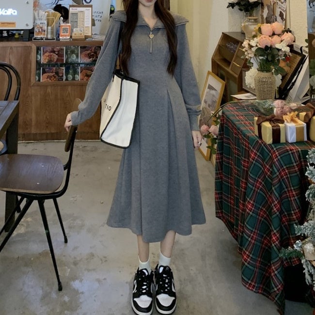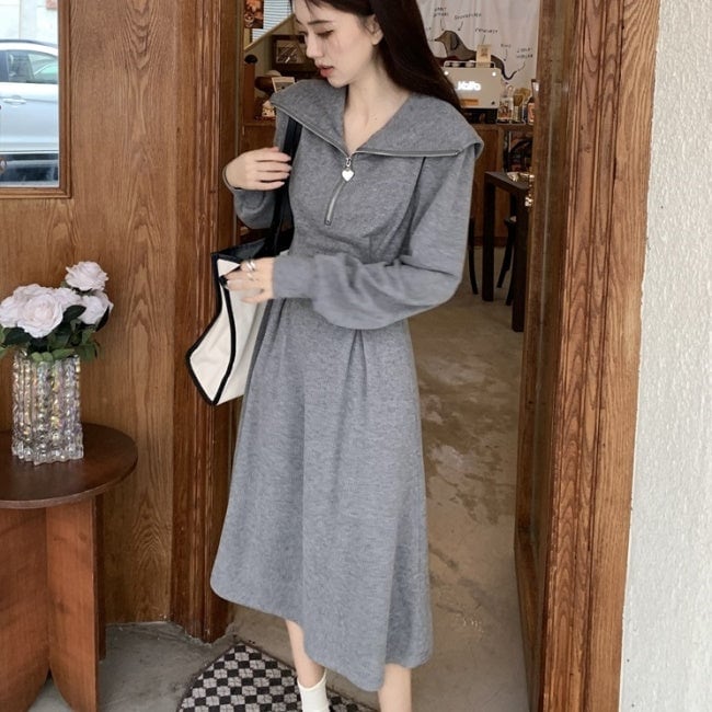 ハーフジップ フレア ワンピース 韓国 ファッション Aライン カットソー ハートチャーム ロングワンピース