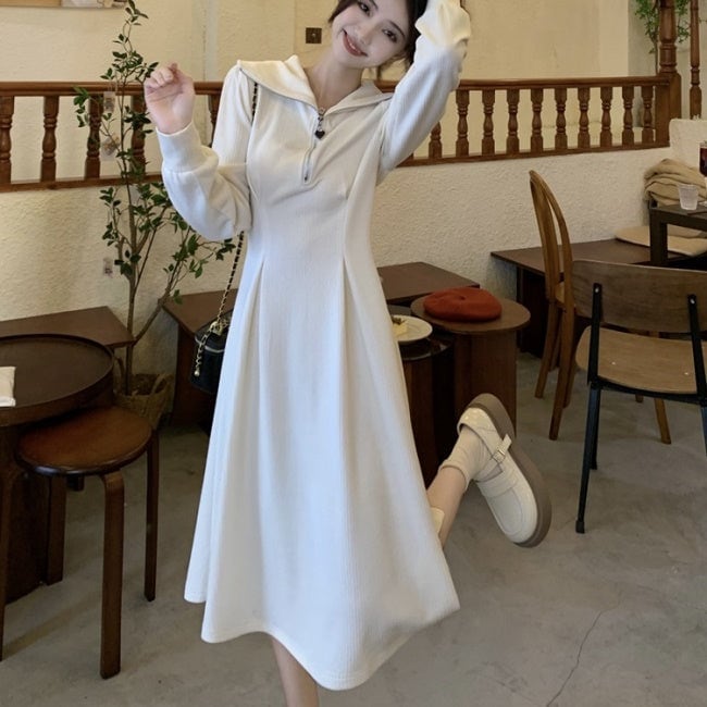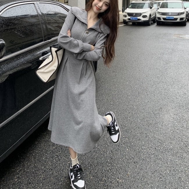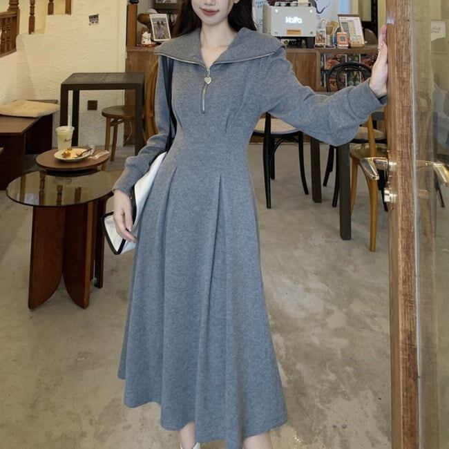 ポロワンピース Aライン 長袖 レディース 韓国 ファッション カットソー フレアワンピース ハーフジップ ハートチャーム