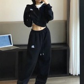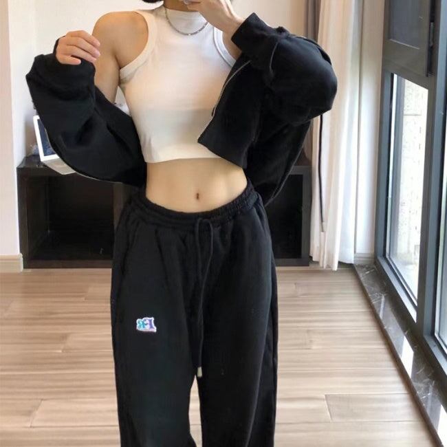 <span style=""font-size: 1.4em;"">黒ジャージ セットアップ レディース 韓国 ファッション ショート クロップド ワンポイントロゴ トラックトップ 裾コード ウエストゴム