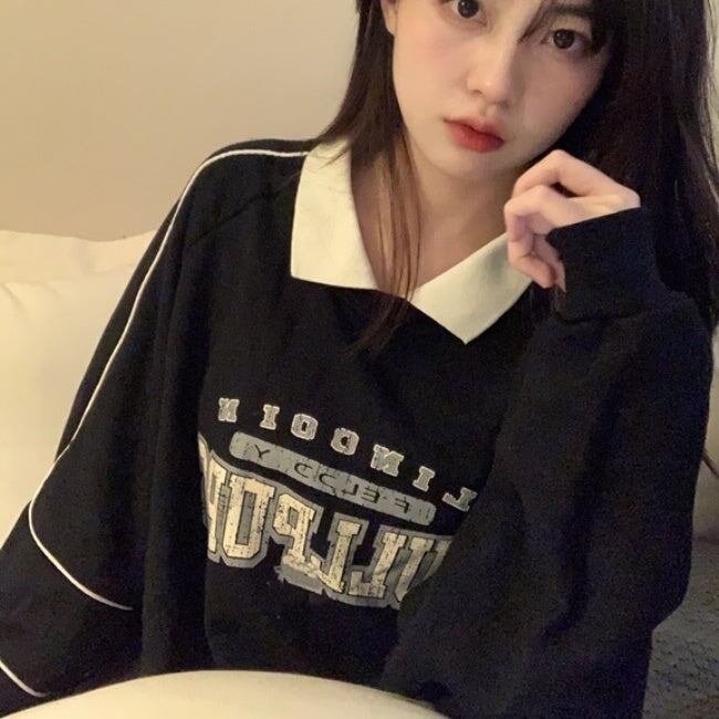 トレーナー ポロ襟 レディース 韓国 ファッション スウェット ロゴプリント 長袖 ポロシャツ