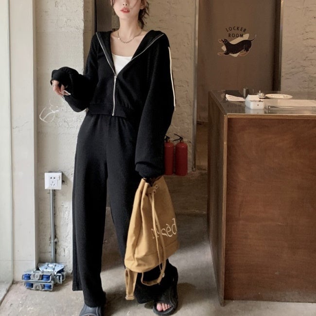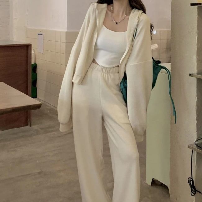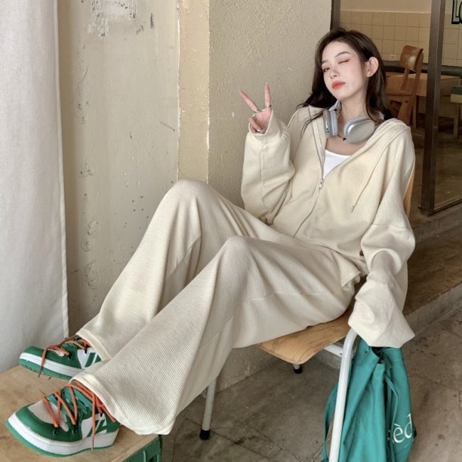 セットアップ パーカー レディース 韓国 ファッション ワッフル ジップパーカー ワイドパンツ 長袖