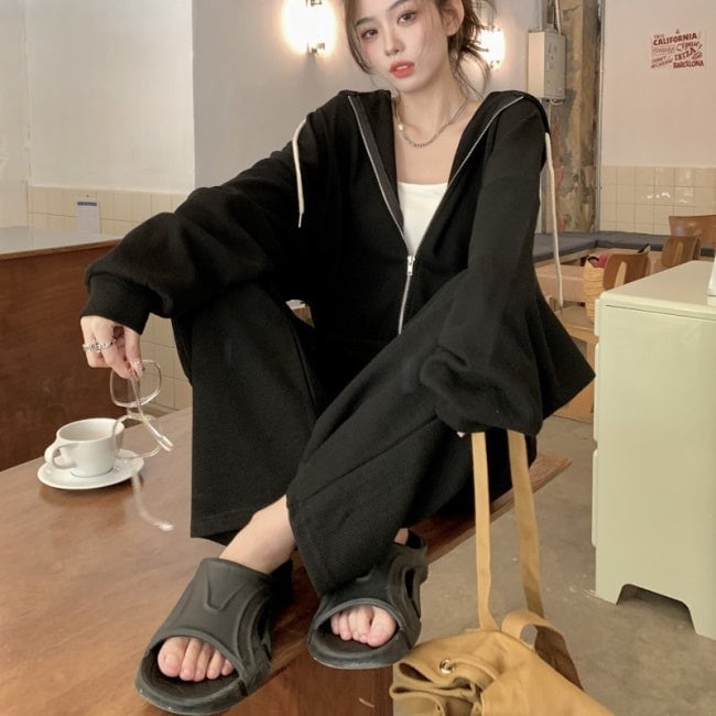 セットアップ レディース パーカー 韓国 ファッション オーバーサイズ ワッフル ジップパーカー ワイドパンツ 上下セット
