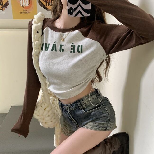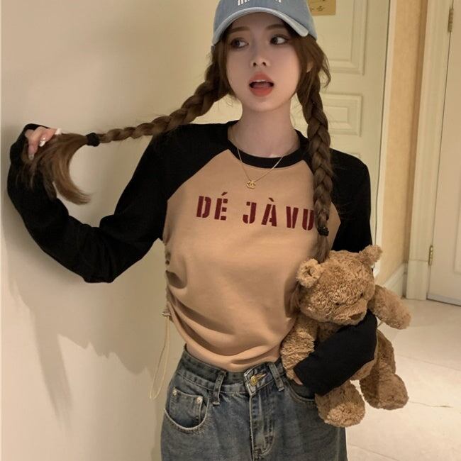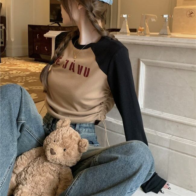 ラグラン ロングTシャツ レディース クロップド ドローコード ロンT 韓国 ファッション ロゴ バイカラー 長袖 春 トップス