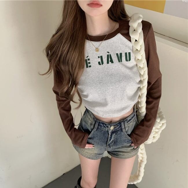 Tシャツ ショート丈 レディース 韓国 ファッション シャーリング ロゴ ラグラン バイカラー クロップド丈 春 トップス