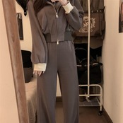 スウェット セットアップ レディース ダブルジップ クロップド ジャケット ワイドパンツ 上下セット 韓国 ファッション スウェット ジャージ