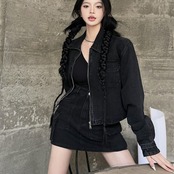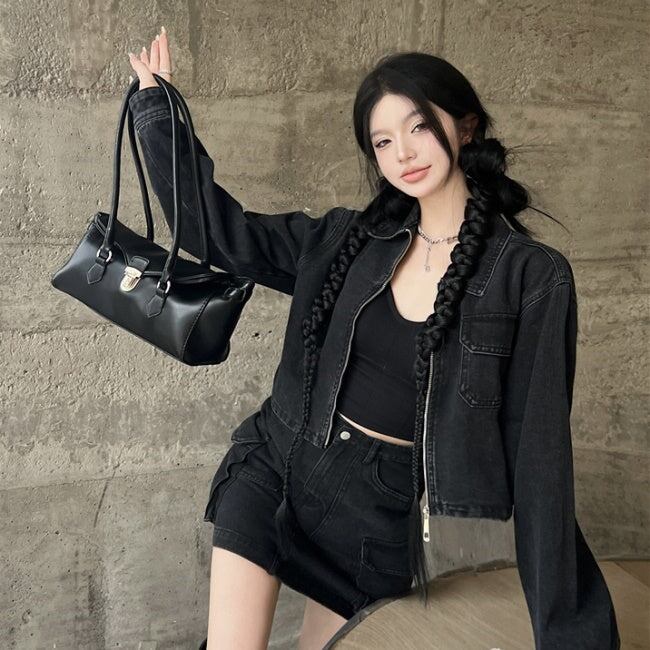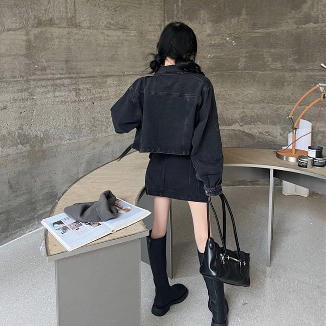 デニム セットアップ レディース 韓国 ブラックデニム ジップジャケット ミニスカート 上下セット