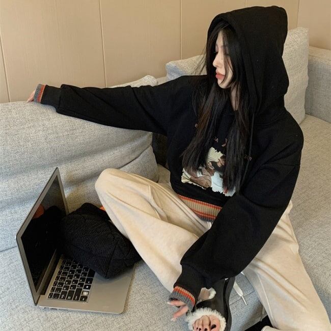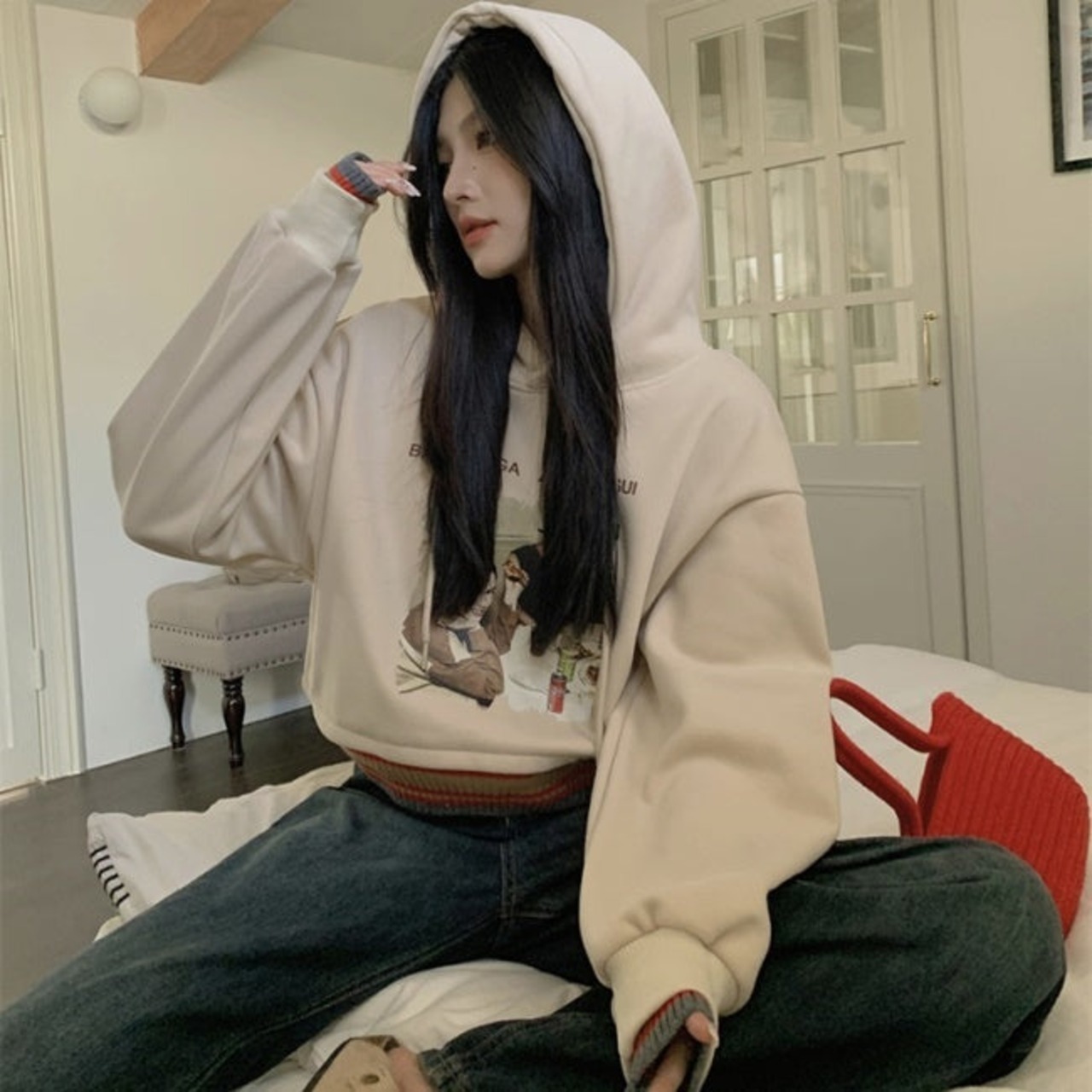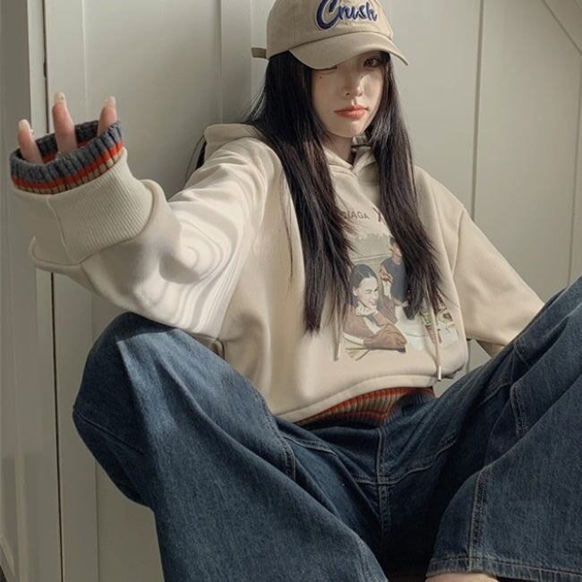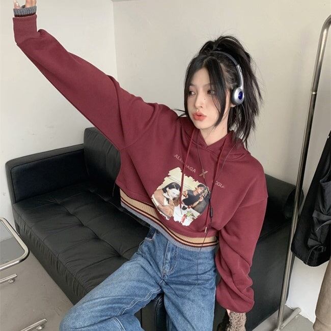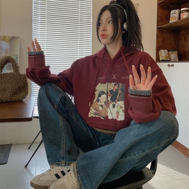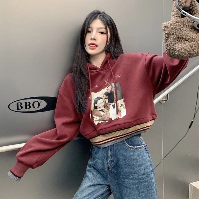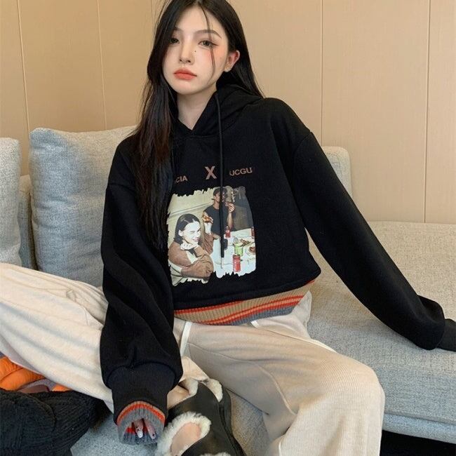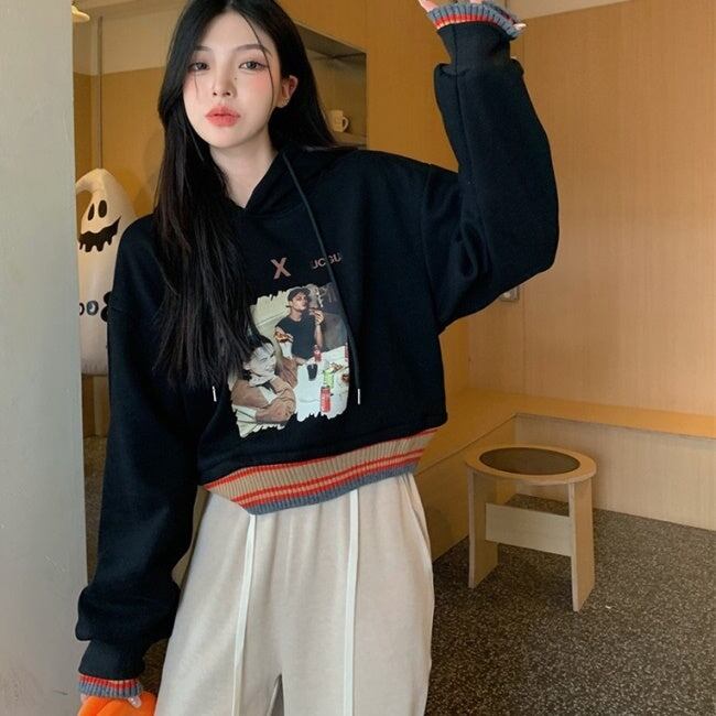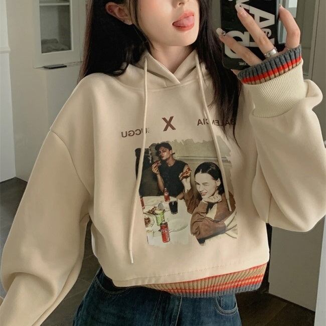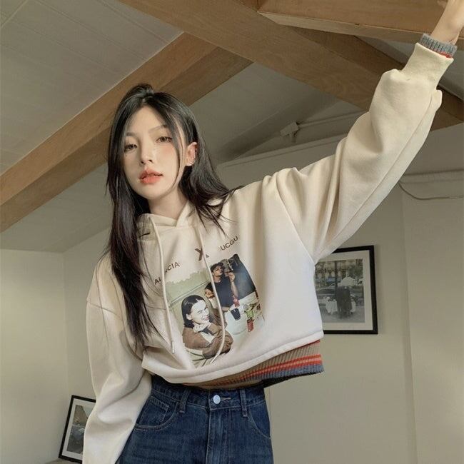 プリント クロップドパーカー スウェット レディース 韓国 ファッション ウェブトリム フォトグラフィック プリント