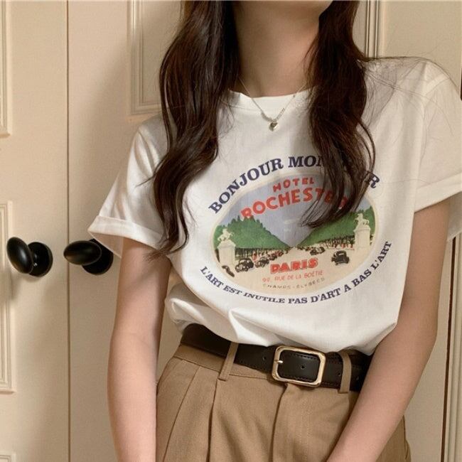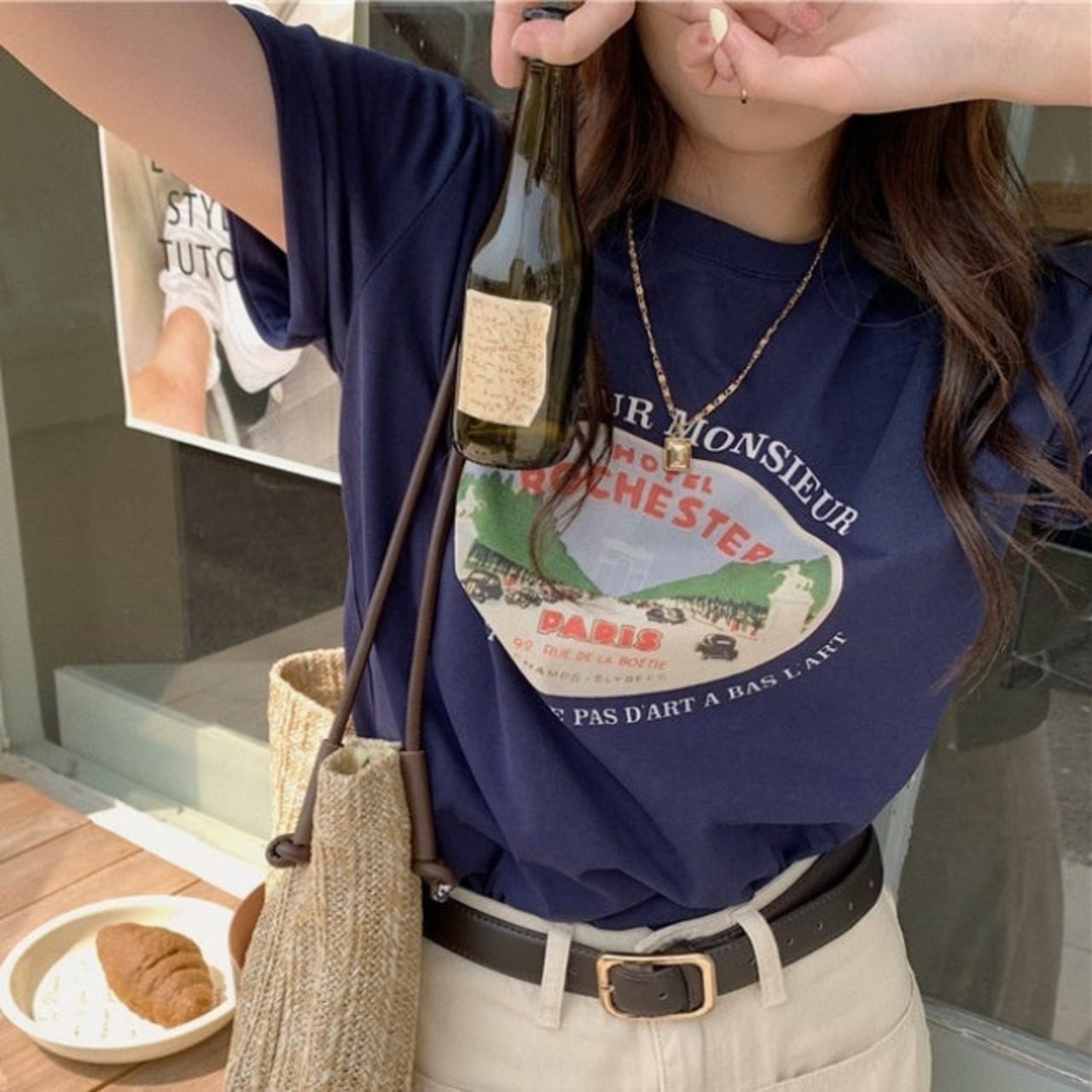 Tシャツ 半袖 レディース 韓国 ファッション プリントTシャツ 白 ネイビー オーバーサイズ ビッグシルエット ロゴTシャツ