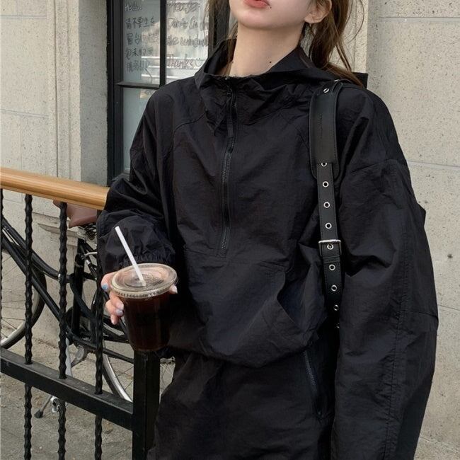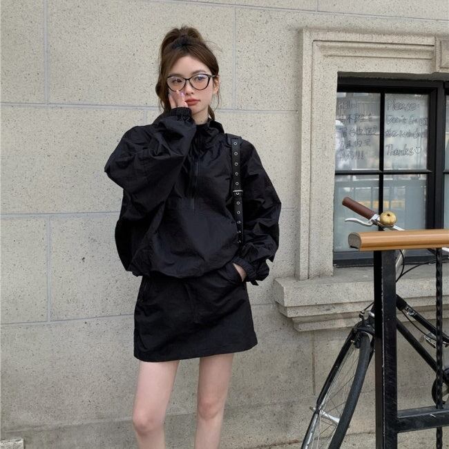 スポーツミックス セットアップ レディース 韓国 ファッション 黒セットアップ ナイロン ウィンドブレーカー ハーフジップ ミニスカート 台形スカート タイトスカート