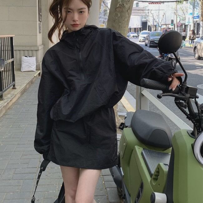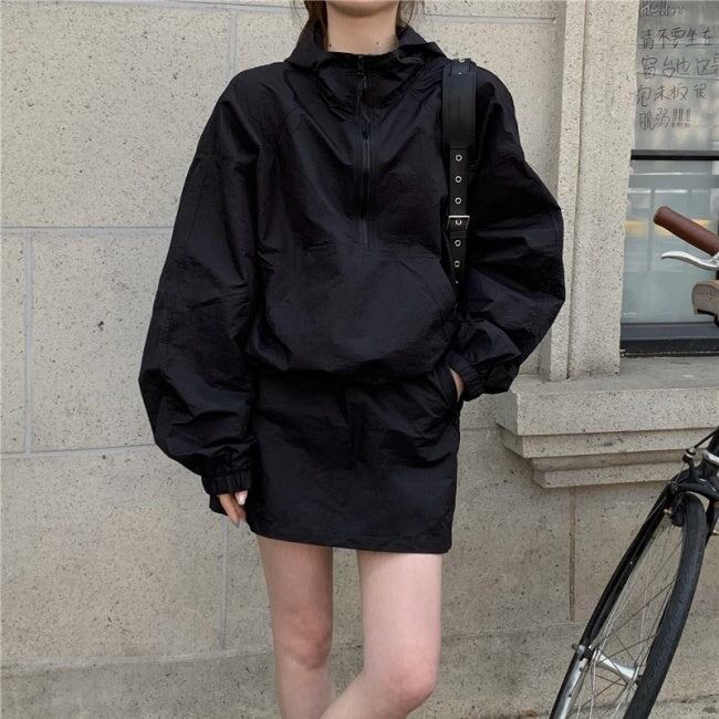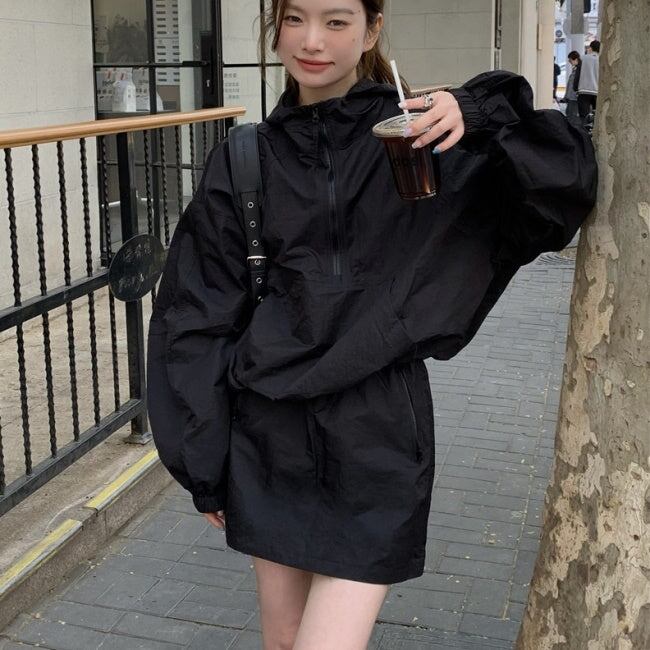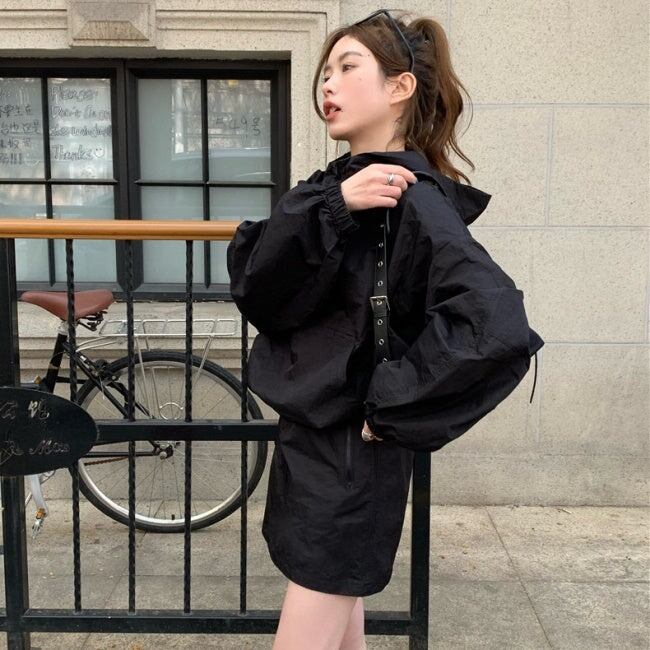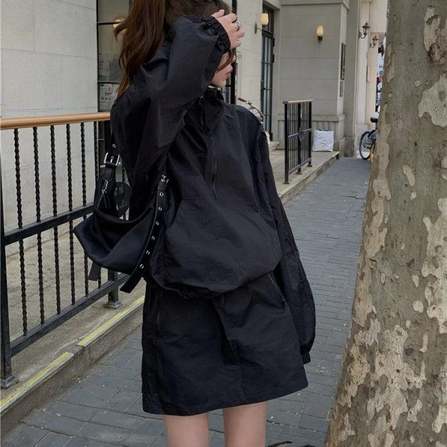 セットアップ レディース 韓国 オーバーサイズ ハーフジップ ナイロンジャケット ミニスカート 上下セット
