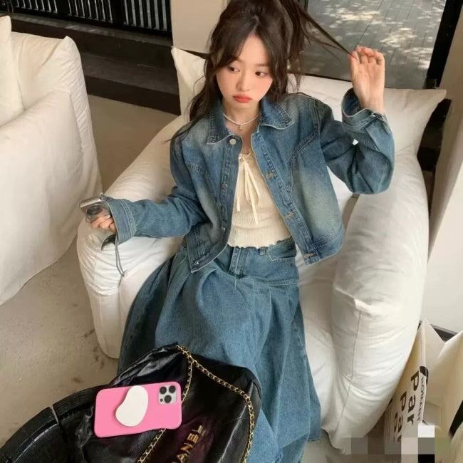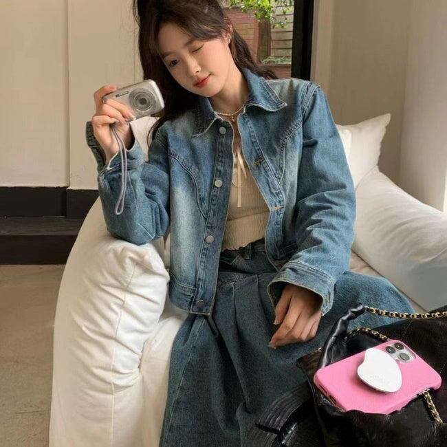 デニムセットアップ デニムジャケット レディース 韓国 ファッション Aラインスカート デニムロングスカート タック プリーツ 切り替えプリーツ レトロ かわいい 上下デニム