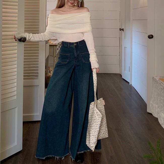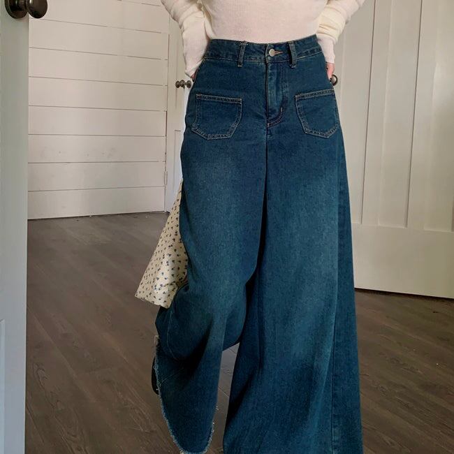 ガウチョ フレアパンツ デニムパンツ レディース 韓国 ファッション Aライン カットオフ フリンジ裾 ビンテージ おしゃれ ブルーデニム