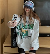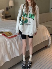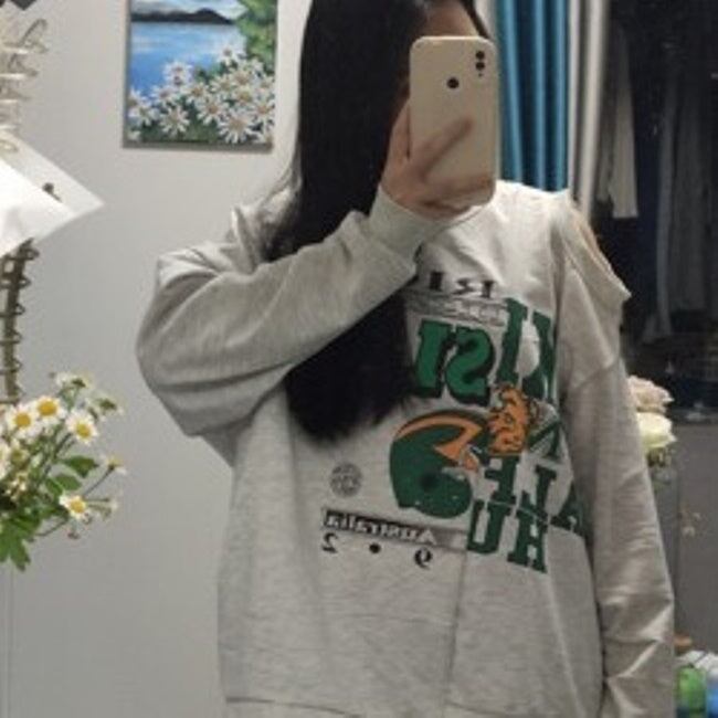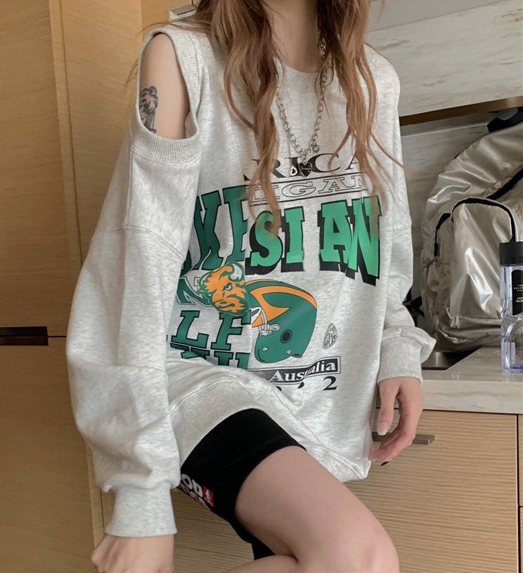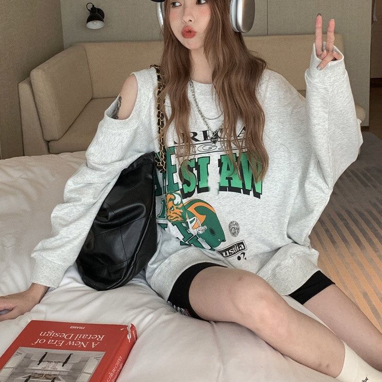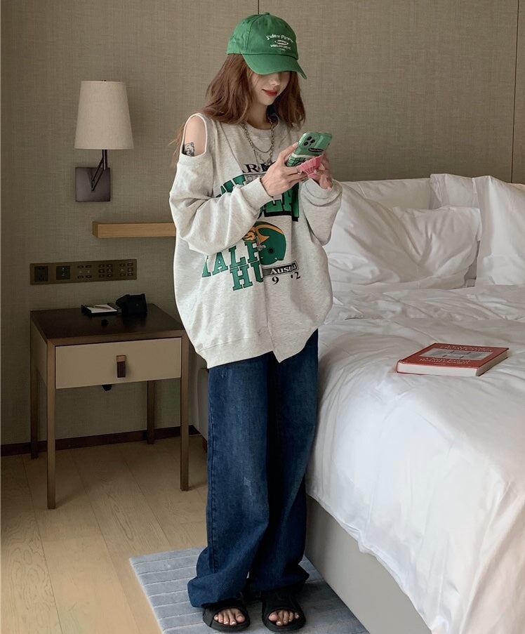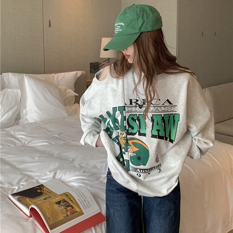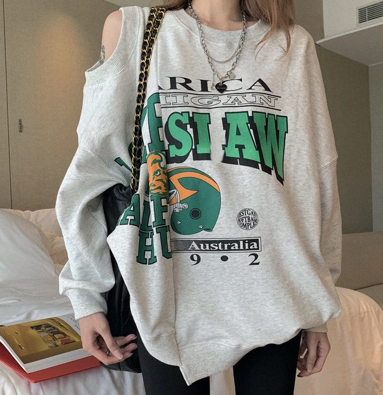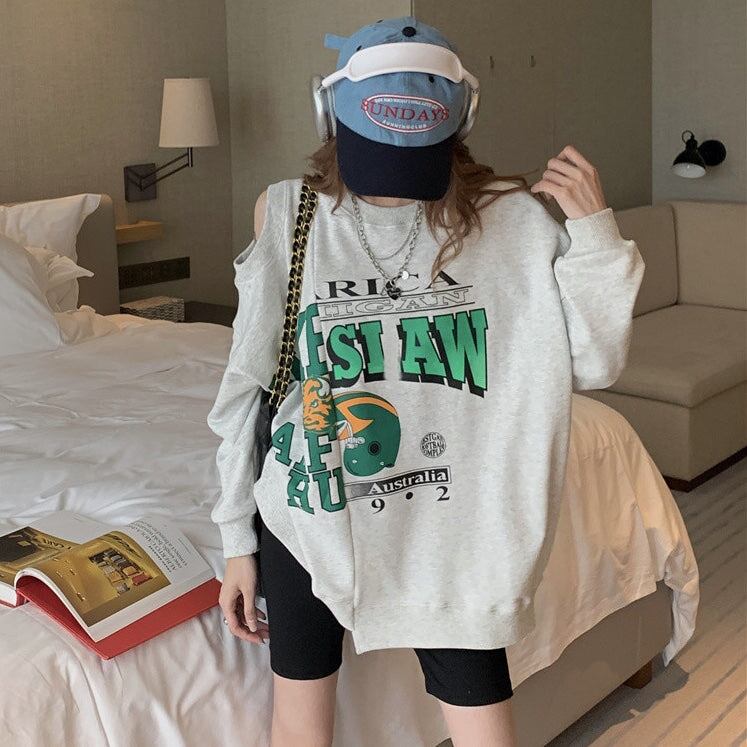 ショルダーカット ロゴ トレーナー レディース 韓国 ビッグシルエット スウェットシャツ ロゴプリント