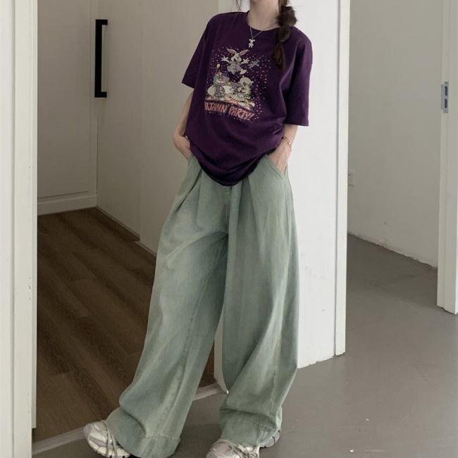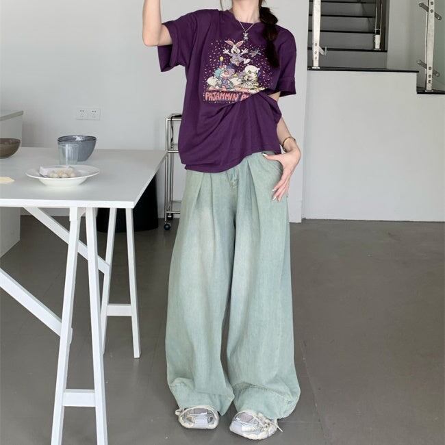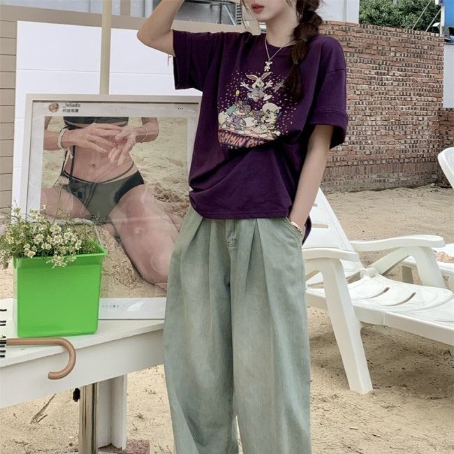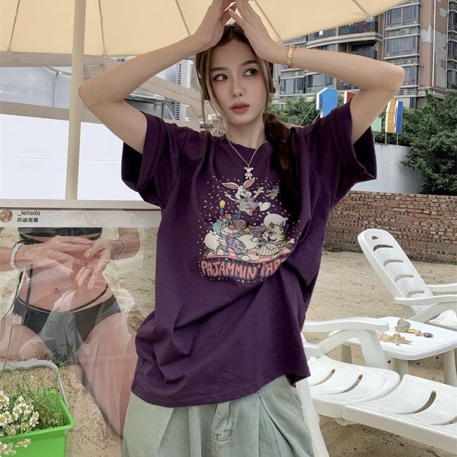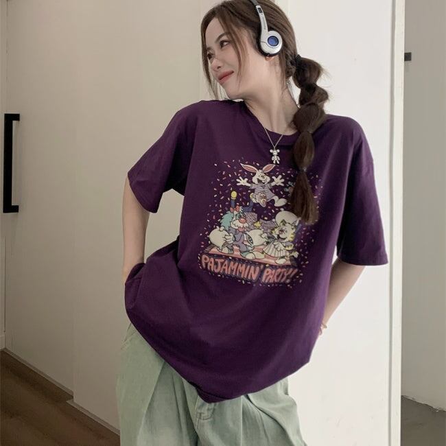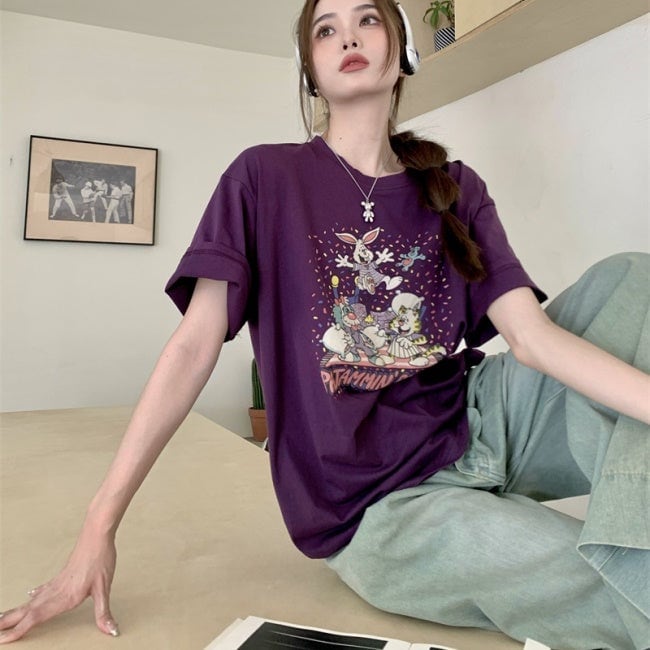 キャラクター グラフィック Tシャツ レディース 韓国 ファッション オーバーサイズ 半袖 夏 トップス パープル かわいい キャラT