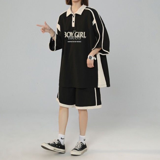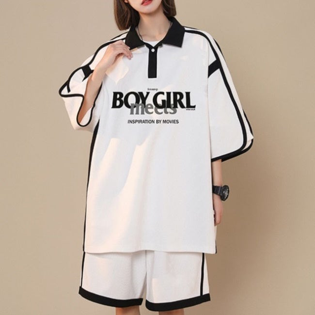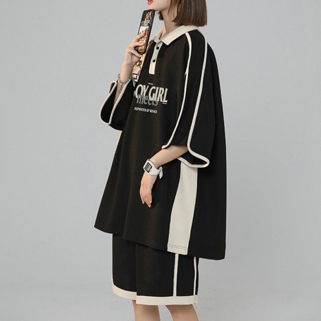 セットアップ ポロシャツ ハーフパンツ レディース 韓国 ファッション ロゴ ビッグシルエット ショートパンツ スポーツ パイピング オーバーサイズ